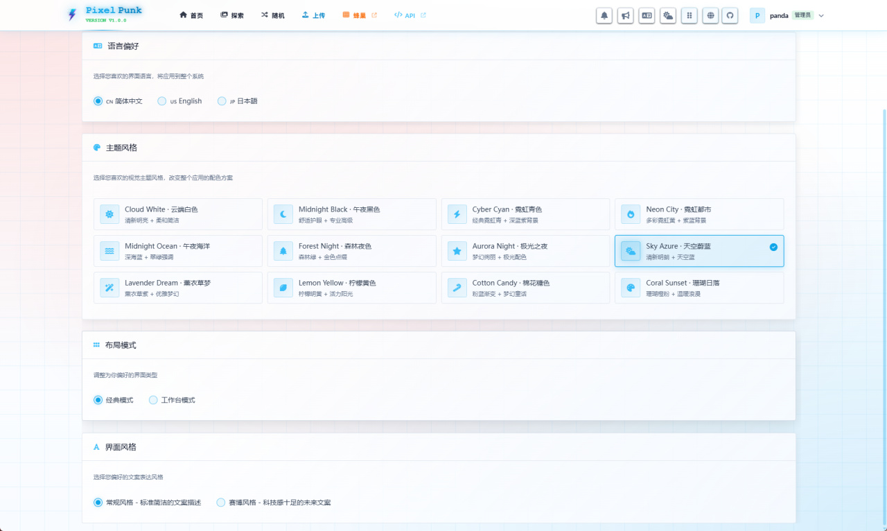pixelpunk也支持多用户管理,用户通过个人仪表盘可以对接项目的API用于图床、随机壁纸等等,同时也支持防盗链设置,UI也拥有多种的主题、布局与风格供用户修改,不管是对于后端的管理还是前端的用户,pixelpunk都做到了尽可能塞进足够多的功能。