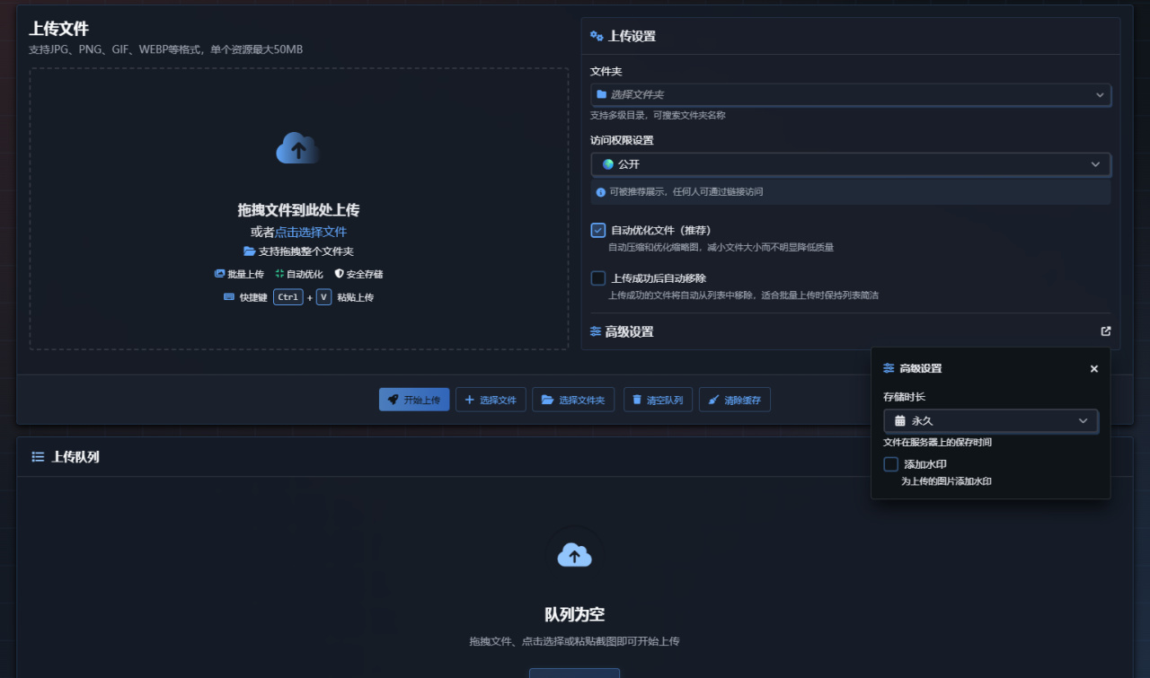 设置好模型之后,来到首页选择上传图片。再上传功能上,项目可选择对上传的图片进行水印添加和自动压缩,以体积更小质量降低不明显的文件。