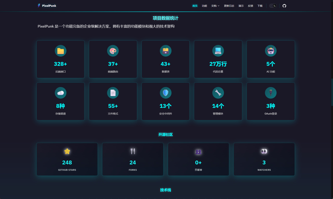 pixelpunk算是今年熊猫觉得最出色的项目之一了,项目的功能非常丰富,技术栈多达30个,总代码数量甚至来到了27万行,这对于一个图库项目来说算是非常庞大了。