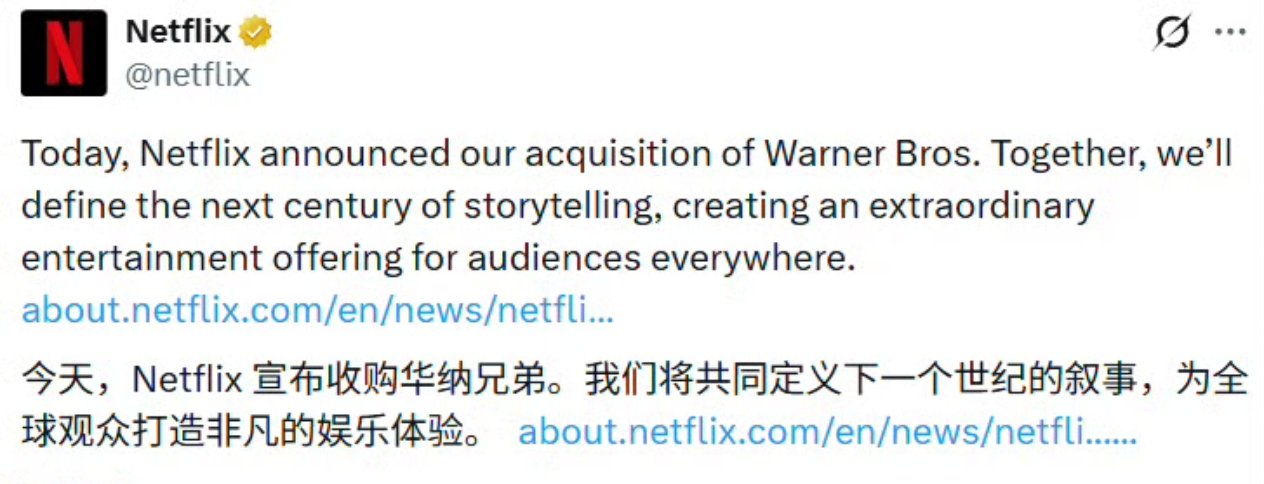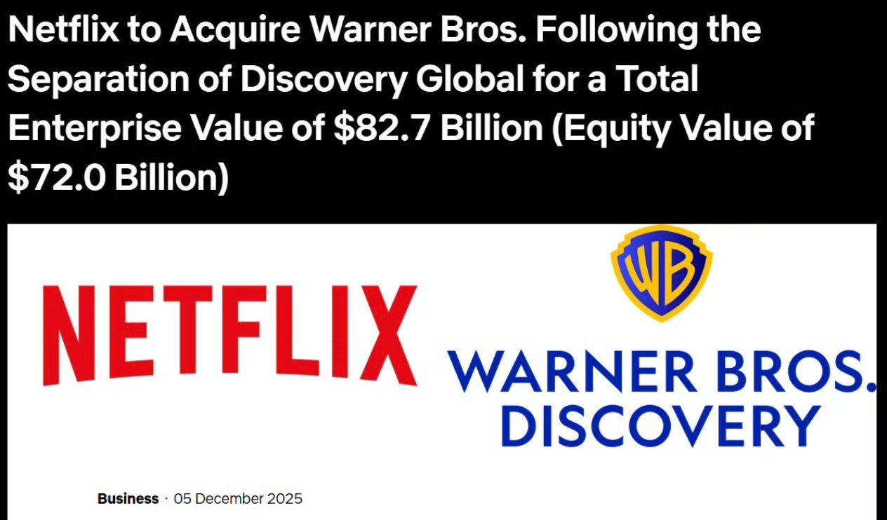 2025年12月5日,流媒体巨头Netflix正式宣布将以每股27.75美元的现金加股票交易收购华纳兄弟探索公司的影视工作室及流媒体业务,整体企业估值约827亿美元。此举标志着娱乐产业即将迎来地震式变革。