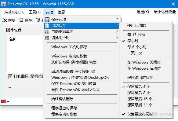在选项中还可以开启自动保存和恢复,每隔一段时间或关机时自动保存桌面布局。