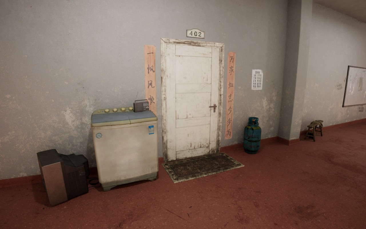 402房间门口放着家电、洗衣机、收音机和煤气罐,墙上贴着回收旧家电的广告。402住户的工作是回收旧家电,收音机里是孩子录的家电回收录音。402是一个三口之家,靠着回收家电维持生计。