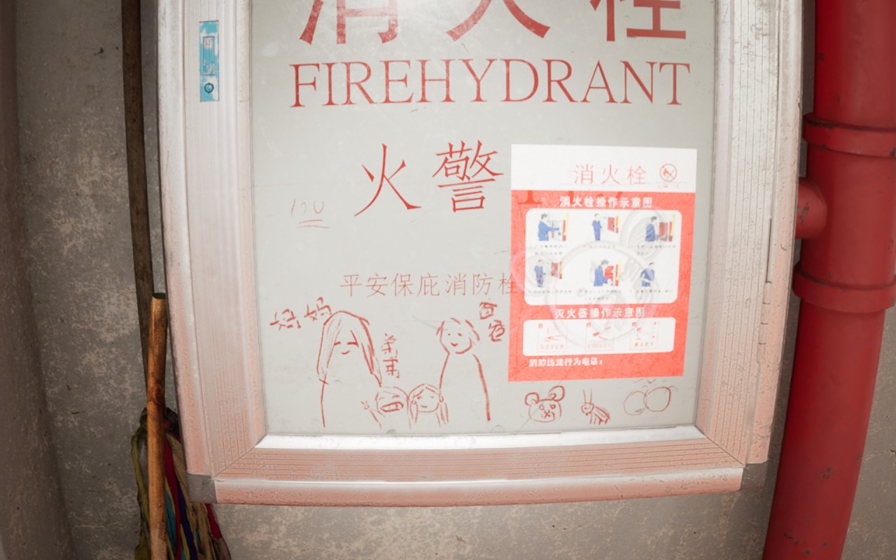 4间房间,对应着4个家庭和4场悲剧。虽然我们无法进入房间查看,但门口的杂物透露着住户们的信息。401门口消防栓的涂鸦,这是一个幸福的四口之家——妈妈、爸爸、姐姐、弟弟。