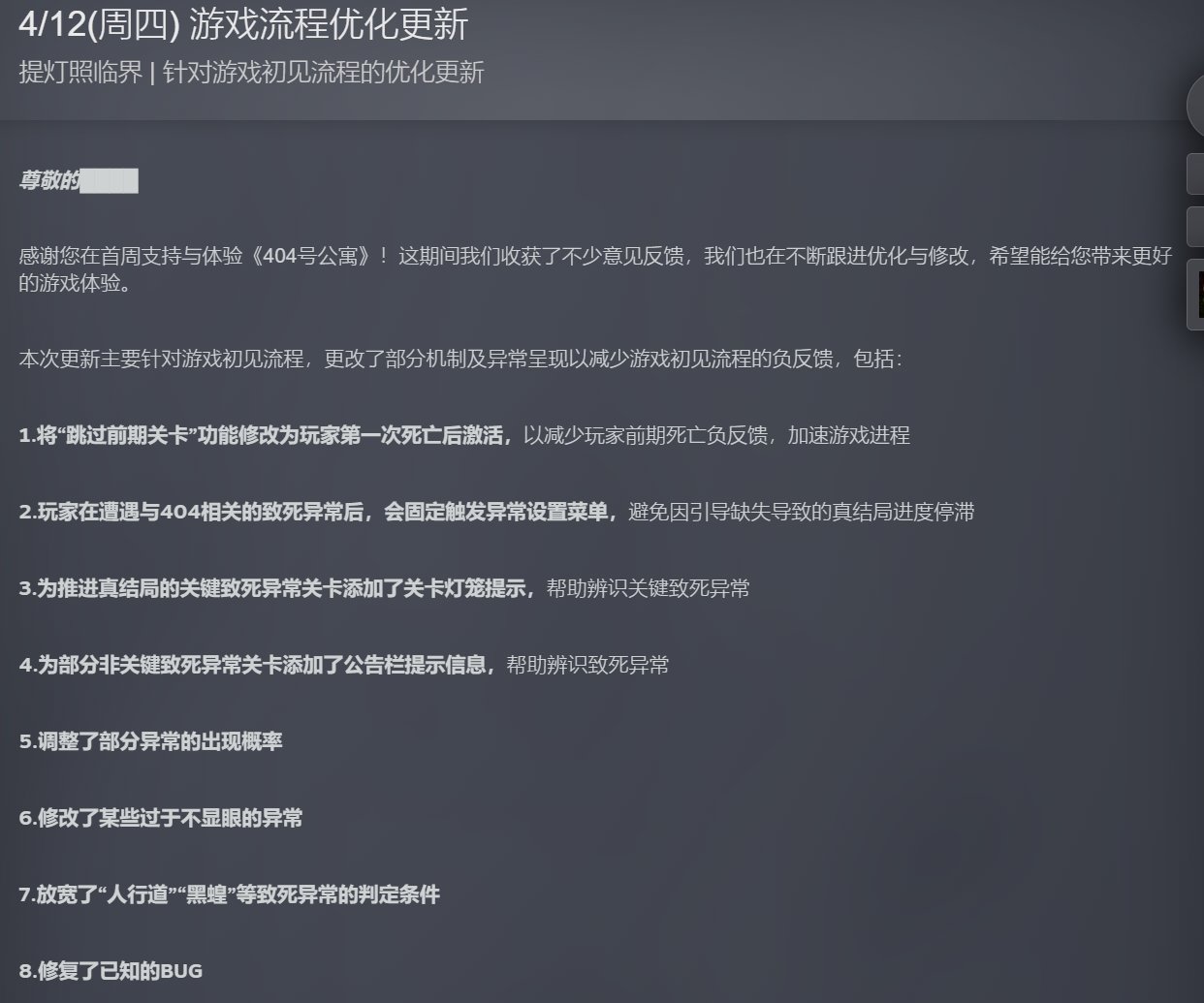 在发售的一周后,游戏带来了一次流程优化更新。放宽致死异常的判定条件,修改了部分不显眼的异常,为部分非关键致死异常增添公告栏提示信息,第一死亡后激活“跳过前期关卡”。