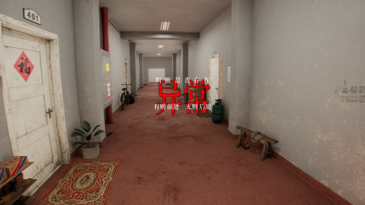 游戏叙事碎片化/异常事件随机触发,没有旁白解释,因此剧情全靠我们的理解。移动的拖把告诉我们401母亲一时疏忽,导致两名孩子追着气球跑上马路,被汽车撞死。于是,母亲跳楼自杀,父亲上吊自杀。