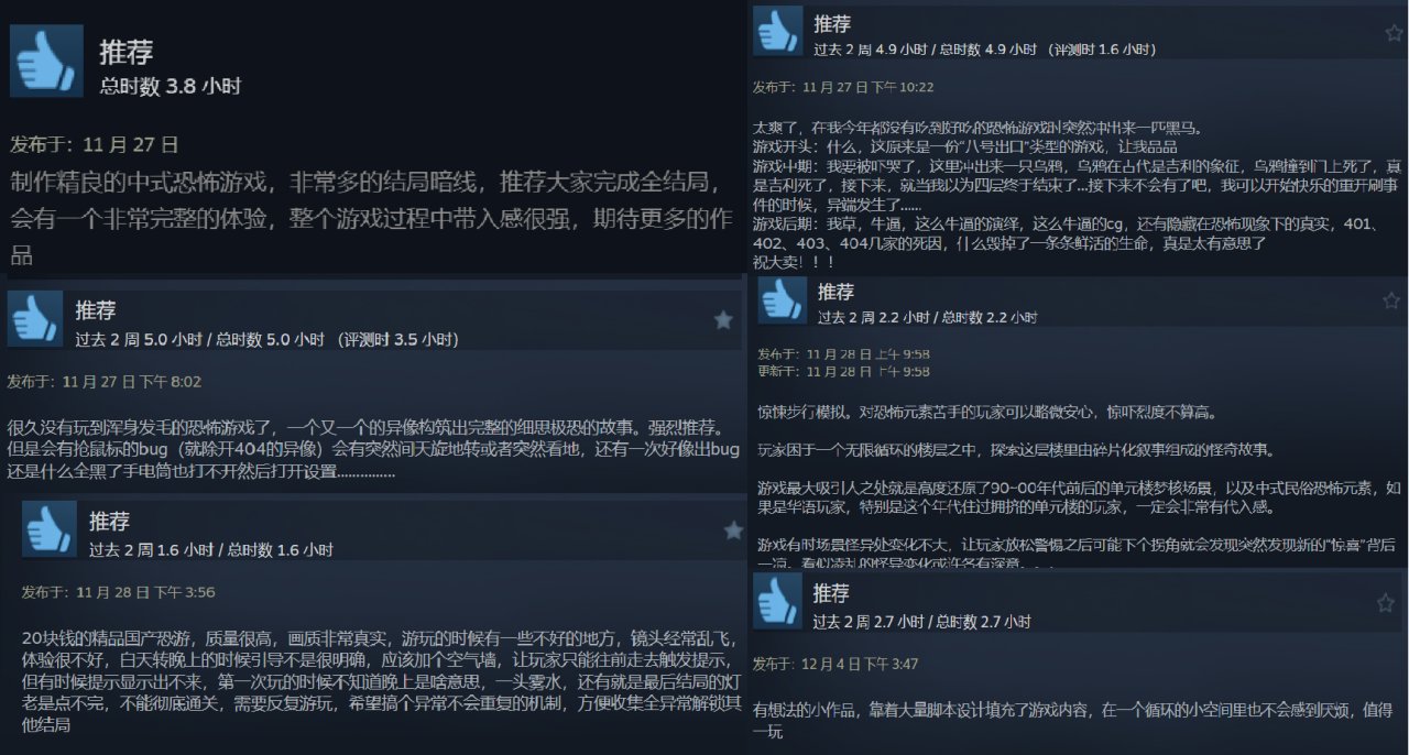 《404公寓》是今年值得一玩的中式恐怖游戏,玩法偏步行模拟器,找异常游戏为主,插入了碎片化叙事。401、402、403、404,4间房子无人生还。在不断循环的楼道中,找寻异常并解开死亡之谜。玩完之后,在小黑盒刷到了游戏制作人的帖子,才发现这竟然是一款00后大学生毕设游戏。