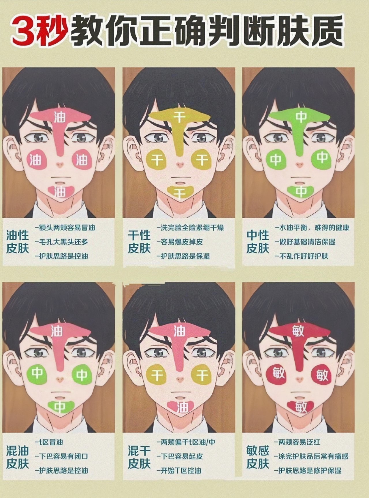 快速自测:晨起用纸巾按压面部——全脸油光为油性,仅T区油为混合性,几乎无油且紧绷为干性