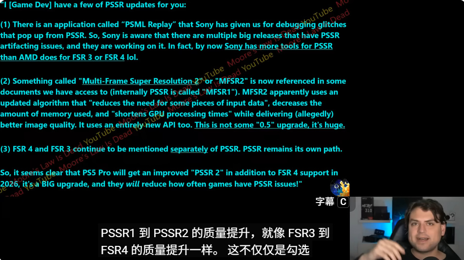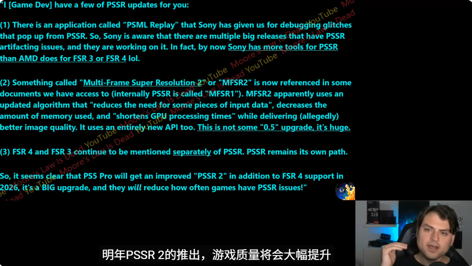 索尼与AMD一直公开表示正合作研发提升游戏性能与画质的新图形技术,最新报告指出,PlayStation超级光谱分辨率技术(PSSR)的下一代升级绝非小幅改进。据YouTuber"摩尔定律已死"透露,游戏开发者已注意到新版PSSR将带来多项重大新功能。