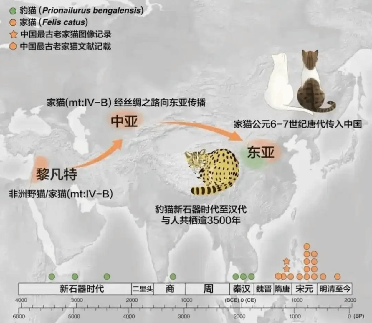 研究发现,从5400年前的新石器时代到东汉末年的所有样本均为豹猫,而唐代及以后的样本则全部为家猫。相较于性格更凶猛的豹猫,家猫不仅适应人类聚落环境,且性格温顺兼具宠物功能,在人类主导的环境中更具竞争力,从而阻止了豹猫恢复与人的共栖关系。现代家猫的全球迁徙故事比之前认为的更为晚近——欧洲最古老的家猫证据来自公元2世纪的撒丁岛,而东亚的家猫则是在唐代才沿丝绸之路传入。