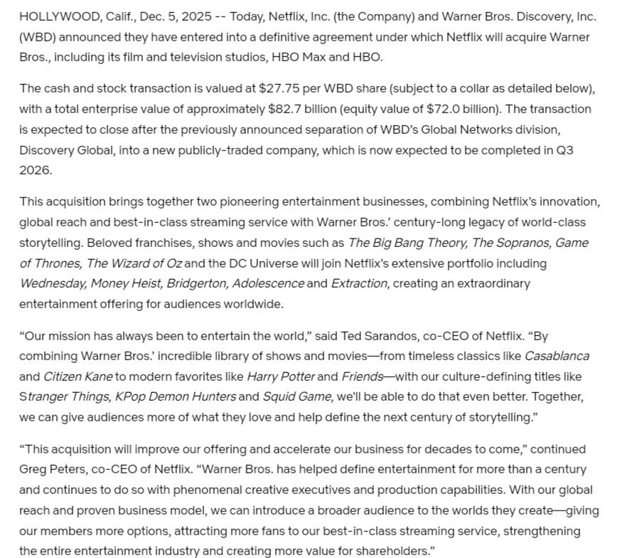 近日,网飞宣布以 827亿美元收购华纳兄弟。此次交易将华纳兄弟的标志性特许经营权和庞大片库,与网飞领先的娱乐平台相结合,为消费者带来更优质的内容体验。网飞将继续沿用华纳兄弟现有的运营模式。
