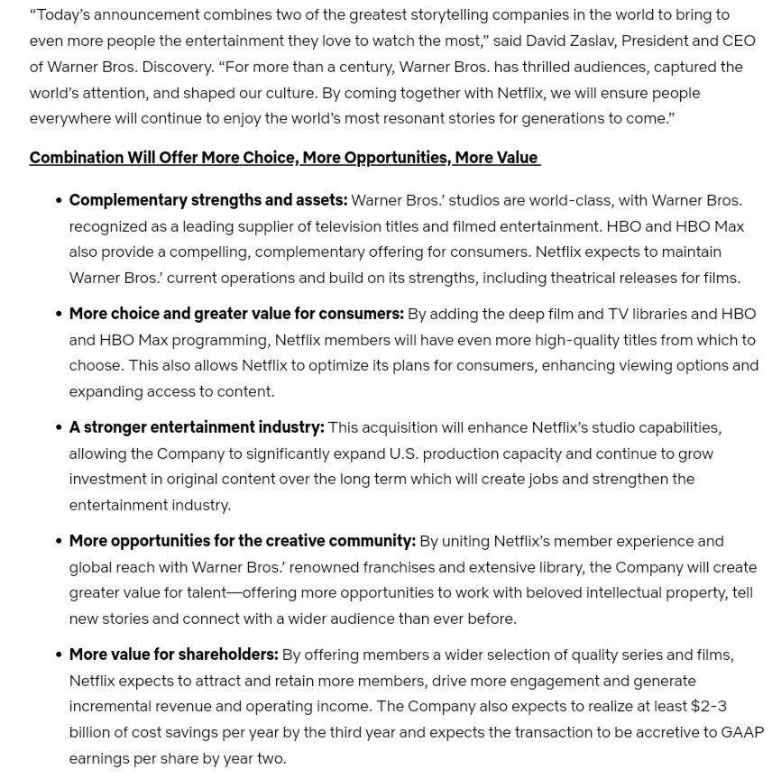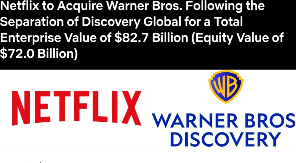 此次合并不仅为消费者提供更多选择和更高价值,也为创意行业创造更多机会,并为股东带来可观回报。这笔收购将进一步推动整个娱乐行业的发展。该交易预计在2026年第三季度完成。此次交易以现金和股票方式进行,股价为每股 27.75 美元,交易的总企业价值约为 827 亿美元(其中股权价值约为 720 亿美元)。