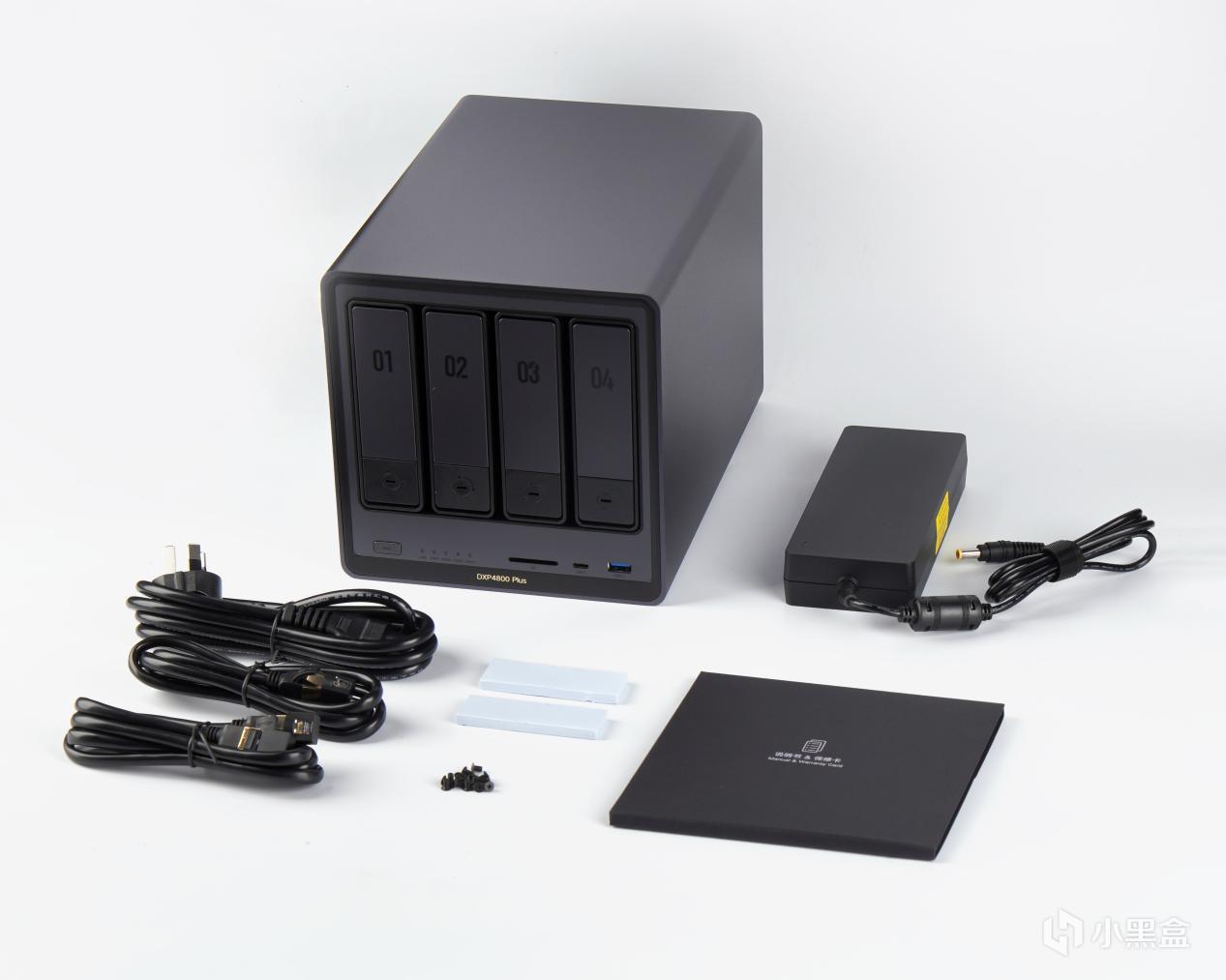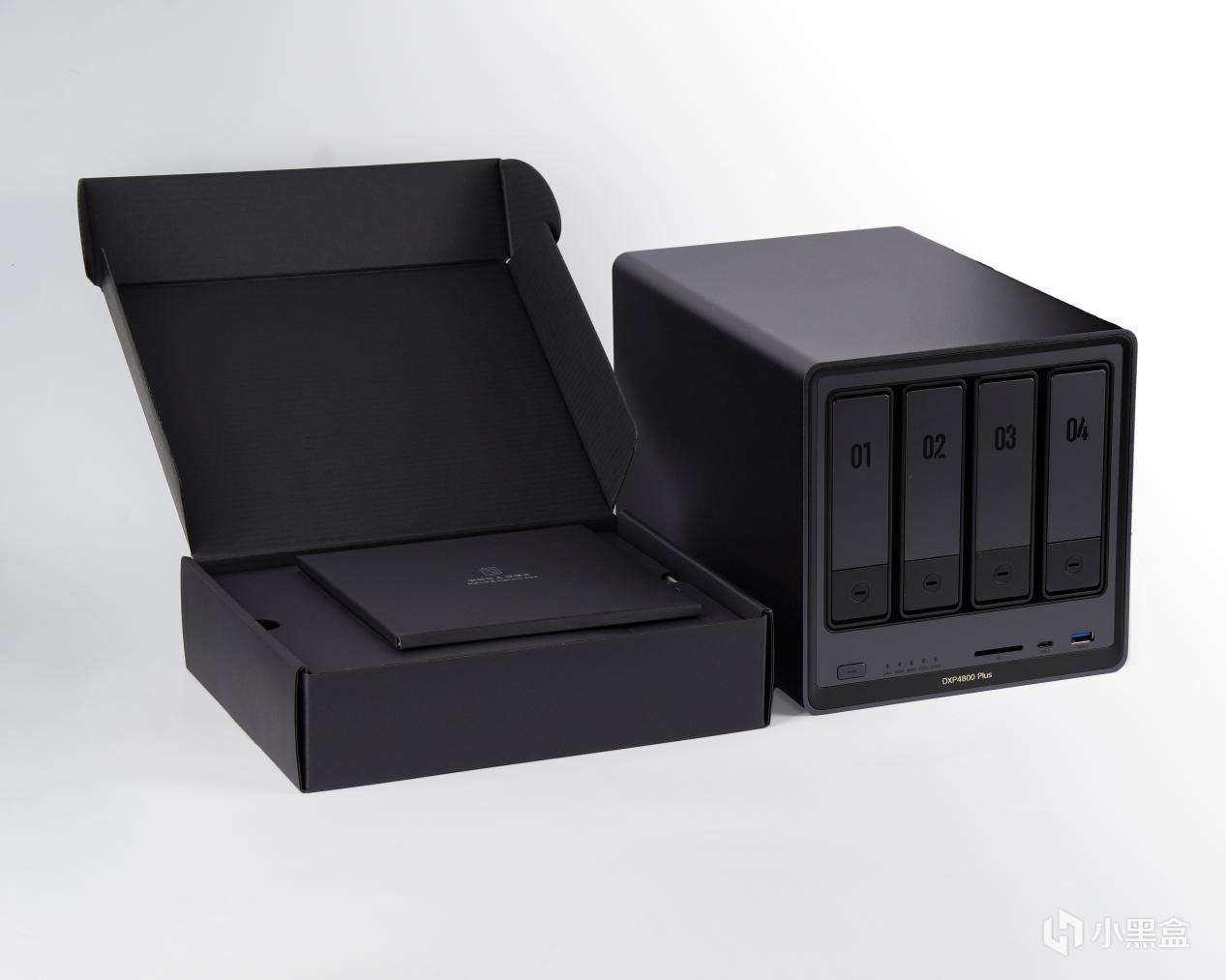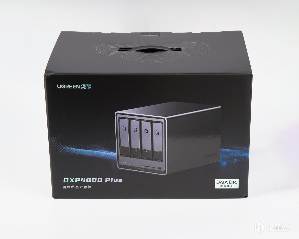 产品方面我选择了最近比较火且风评还算不错的绿联DXP4800 Plus,包装方面因为手上没有他家其他的NAS所以无法对比,但与之前入手的充电器包装还是比较相似的,以黑底为主的底面设计配合上产品的渲染图,实话实说,颜值还是比较不错的,周边则围绕着产品名称以及品牌LOGO