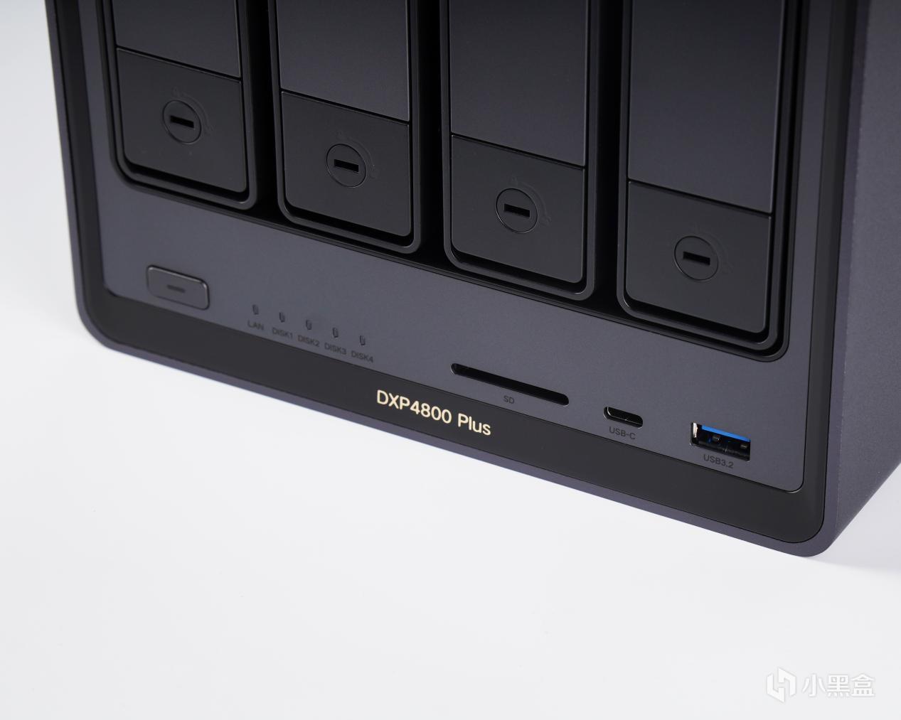 而转到正面则更为有趣,在正面除了1个Type-C Gen2接口以及1个USB3.2 Gen2的接口(两者均均支持10Gbps速率)外,还有一个SD卡接口,这对于我来说可算是天神下凡了,毕竟我使用的是索尼半幅机——ZVE10,其并不支持CFB卡,只有单SD卡槽,而手机传输RAW的速度又非常缓慢,所以基本只能靠高速读卡器来进行照片备份,但绿联DXP4800 Plus本身自带有SD卡槽,那我就可以直接插入之后使用鼠标在NAS后台直接拖拽备份了,速度可比读卡器之类的快多了