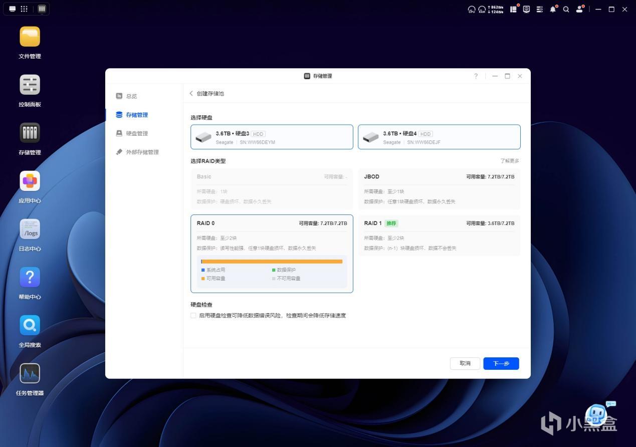 后面就会出现让你选择存储器的引导解码了,我这边会比较追求速度,因为后续会将其作为挂载盘挂在电脑上作为一部分小型游戏的安装区,所以我这边选择的类型是RAID 0,如果是作为纯备份的话,其实我会建议使用RAID 1,毕竟RAID 0是将多盘合一了,有一块出现问题,那数据都会丢失,但1则不会有这种风险,不过UGOS Pro的整体界面还是非常好看的,有点deepin OS的感觉了,并且虽然是Linux为底层,但实际上手的确对小白很友好,不像自组时需要来回打小黑框,原生Linux有些内容你输入是不会在小框中显示的例如密码,实际使用真的很头疼,而UGOS Pro则没有这种情况,这点好评