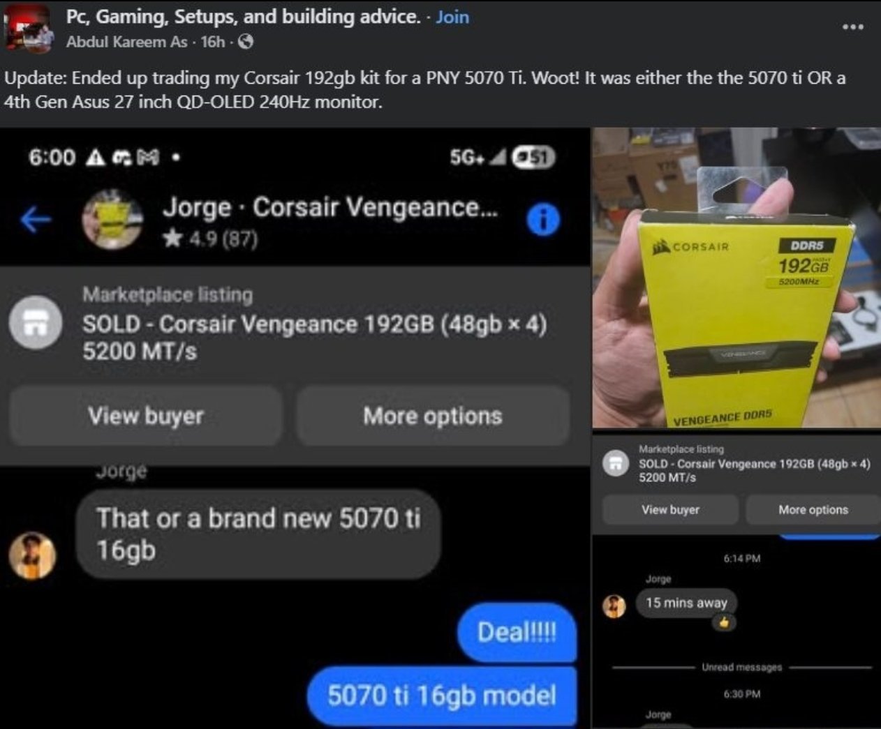 一名玩家在二手市场用一套海盗船192GB DDR5内存套装,换取了PNY RTX 5070 Ti显卡。这笔表面平等的交易却引发广泛讨论,因当前内存价格飞涨,该内存市价已达2250美元,而RTX 5070 Ti显卡仅售约750美元。这意味着这位玩家用价值约为三倍显卡的内存进行了交换。