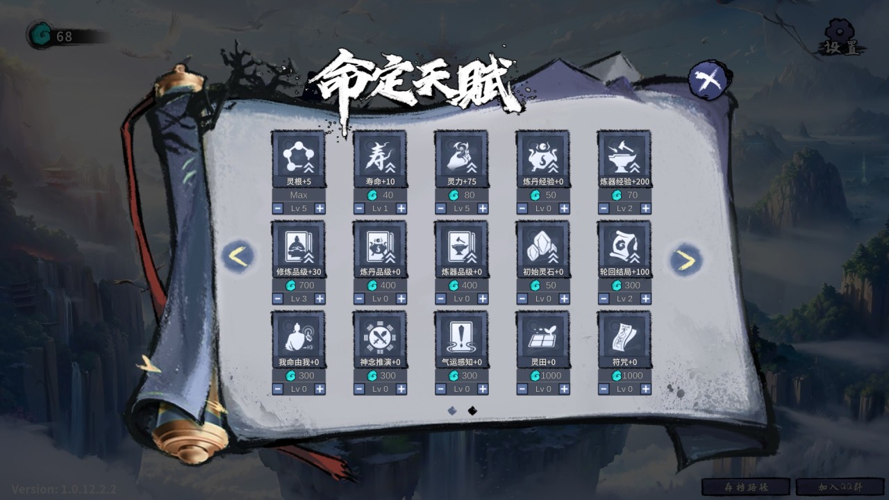 命定天賦的話我給大家說一下我的建議吧,首先開荒比較重要的就是悟性與輪迴獲取數,我最開始開荒是把悟性點到了十點,隨後升級了輪迴點獲取數。命定天賦的選技能點是要有輪迴點數的,升級這個也是爲了在隨後的流程裏儘可能獲取更多點數。大家在後麪點數多的時候可以重點升級修煉品級,有大概率出金色事件,我們後面會講到。因爲開局的點數並不多,差不多四百點,剩下的可以點一些速度或者攻擊力這一塊的加點,最後留二三十個點來選本次輪迴的固定天賦。