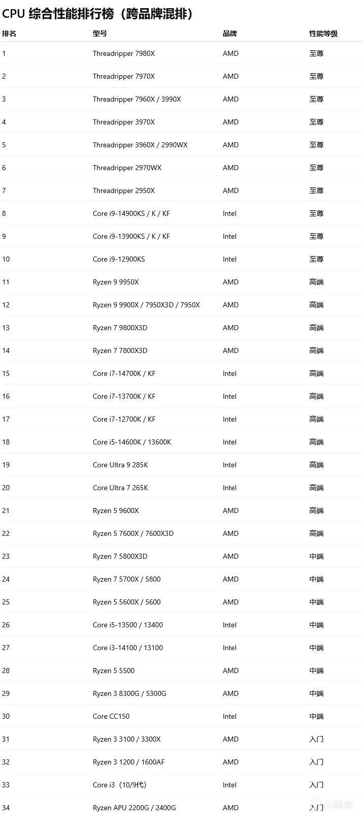 本文将 Intel / AMD CPU 以及 NVIDIA / AMD GPU 按性能从高到低混合整理成统一排行。