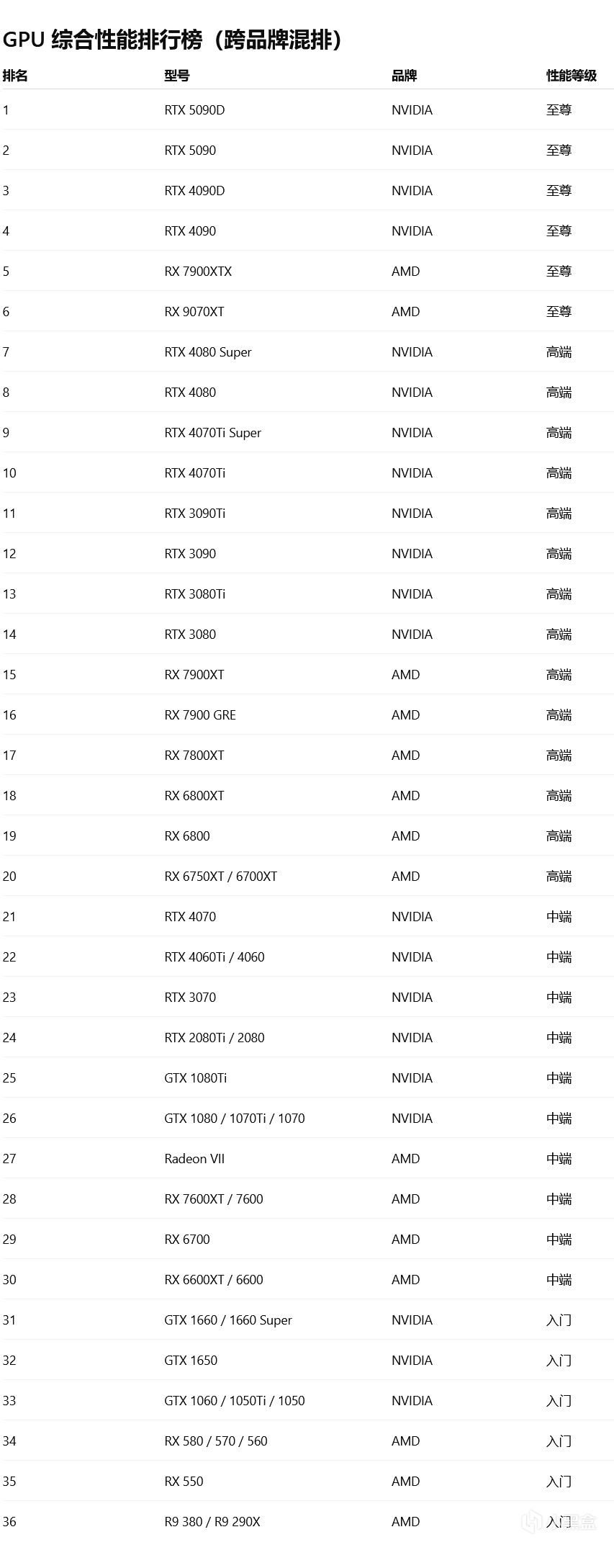 按性能排序:最强 → 高端 → 中端 → 入门。