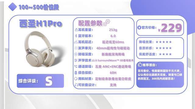综合推荐理由:在百元头戴赛道,西圣 H1Pro 堪称 “平价卷王” 般的存在。它在听感、降噪、佩戴等关键维度全面拉满,硬刚千元级入门配置,凭实力成为数码圈公认的 “百元档天花板”,稳稳坐稳性价比王者宝座,是学生党、通勤党闭眼入的最优解。
