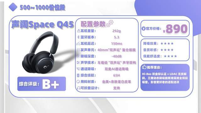 综合推荐理由:Hi-Res 双金标认证 + LDAC 无损解码,45dB 深度降噪适配多场景,续航表现均衡且支持多模式切换,做工扎实性价比突出,适合注重音质与降噪的学生党、通勤族及办公人群。