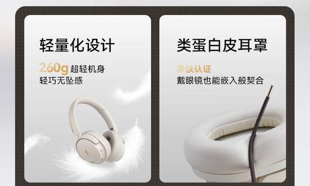 佩戴体验:耳机重量仅约208克,比多数头戴式耳机轻了近30%。头梁可调节并搭配记忆棉耳罩,长时间佩戴对头顶和耳朵的压迫感很小。不过,其耳罩采用的是蛋白皮材质,虽然官方表示透气性不错,但夏季长时间使用依然会感觉有些闷热。
