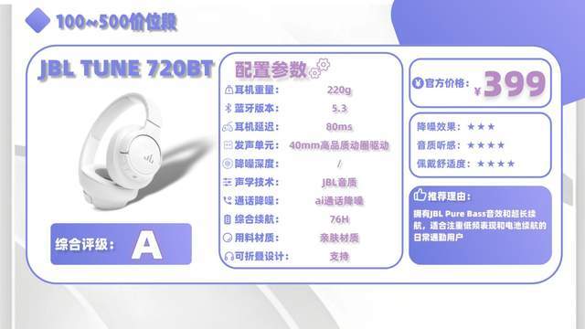 综合推荐理由:拥有JBL Pure Bass音效和76小时超长续航,支持蓝牙5.3与多设备切换,适合注重低频表现和电池续航的日常通勤用户。