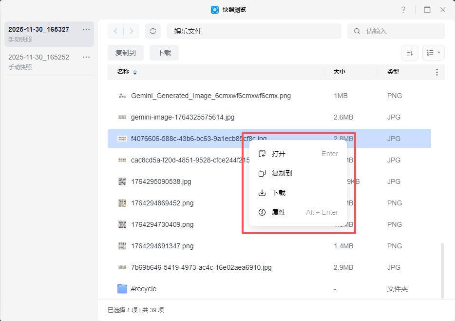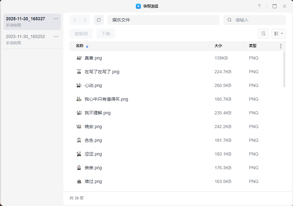 在预览界面,不需要再直接整个快照进行恢复,可以选择文件进行下载或复制,解决了单独文件的恢复问题。
