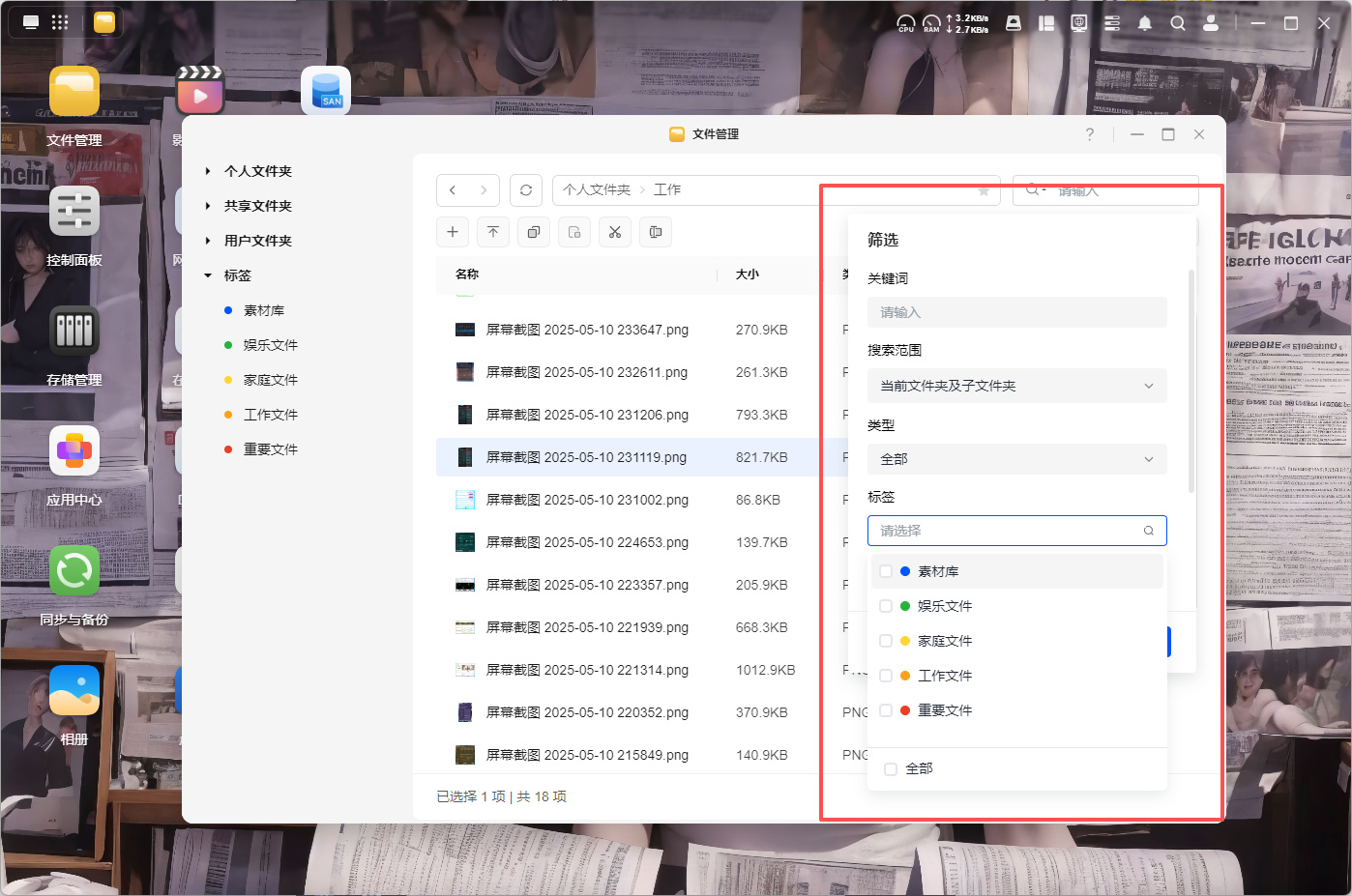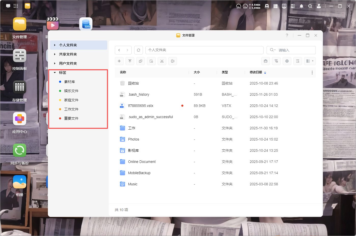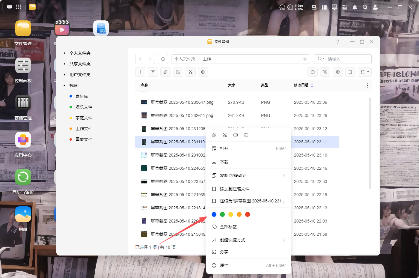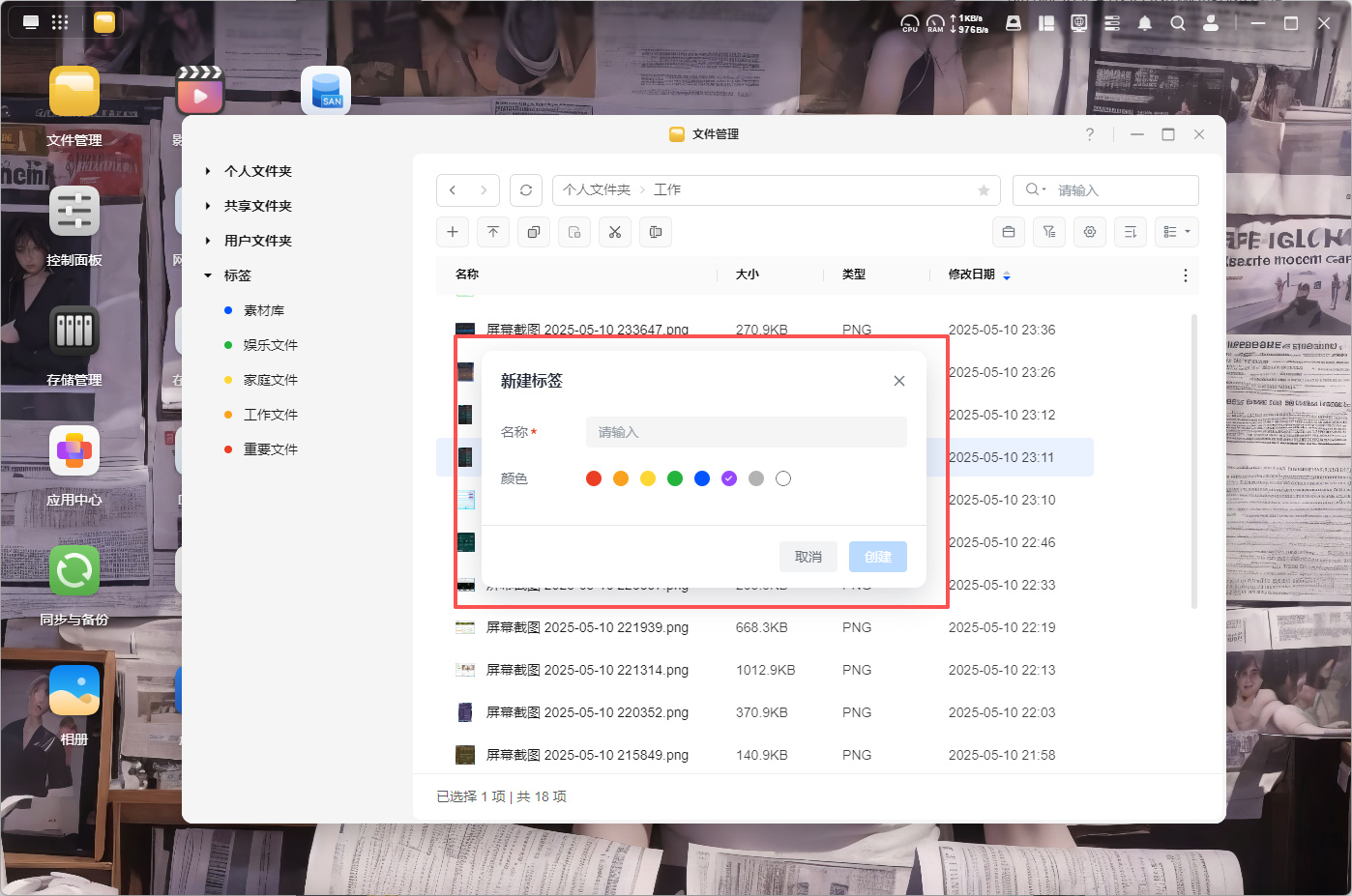现实中人们往往会通过贴便签、标签的形式来进行文件的分类,这种简单明了的方法在Mac OS以及各种知识库和笔记软件中也有,通过标签能直接缩小我们想要查询的文件类型范围,而这次绿联也讲这个功能更新到了文件管理中。