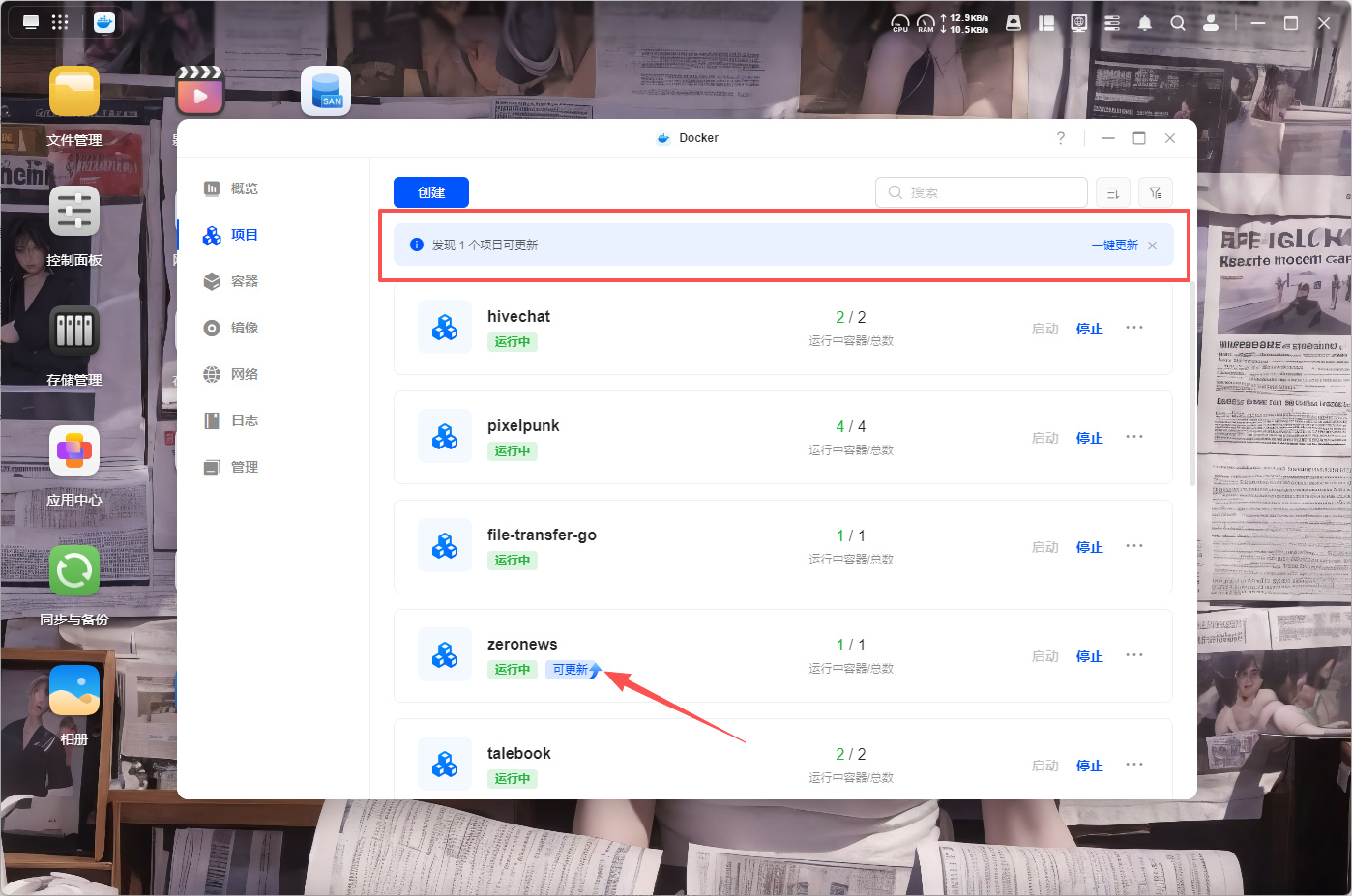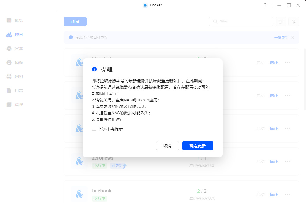 新版本中,当部署的项目或容器又更新时,会在置顶显示提示,同时项目或容器旁边也会出现可更新的标识,点击置顶能进行批量更新,点击单一项目则是单独更新,之后会弹出更新提示,需要注意新版本的容器或项目配置是否有变化,如果涉及到了变量或映射变化则需要手动调整,不然可能会导致更新容器启动失败等问题。