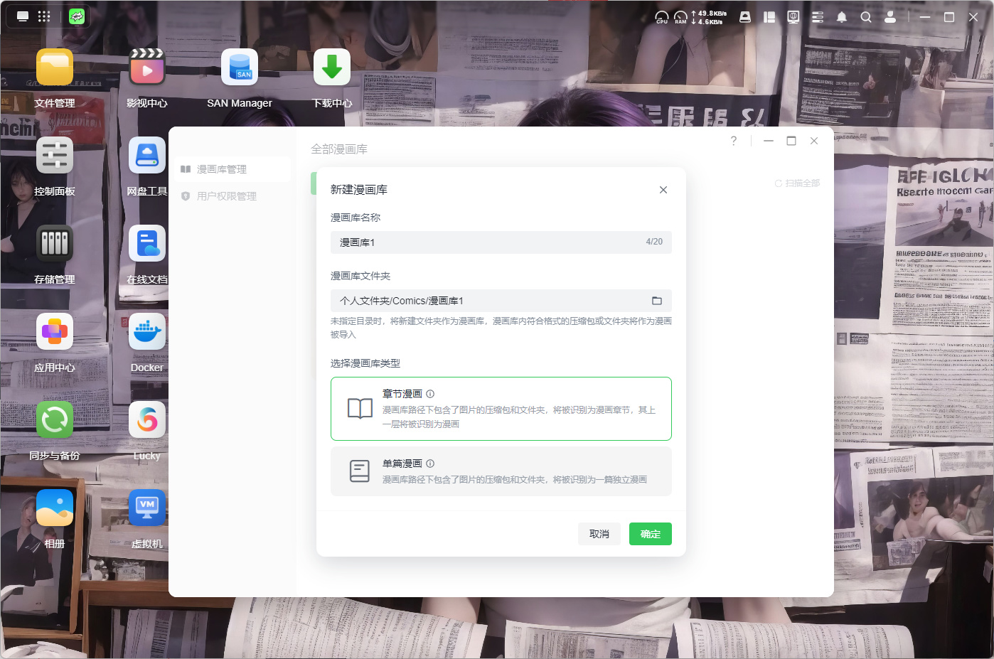 打开漫画应用首先我们需要新建漫画库,名称和漫画文件的路径自行设置,在类型选择上支持章节漫画和单篇漫画,其实就是定义漫画的路径规则,这个根据自身使用习惯来设置就可以了。