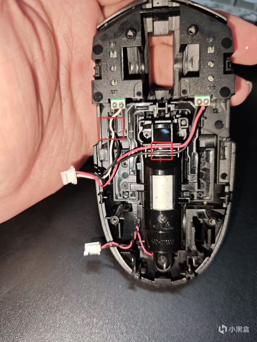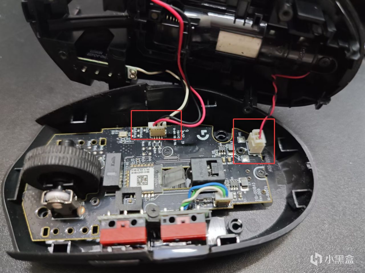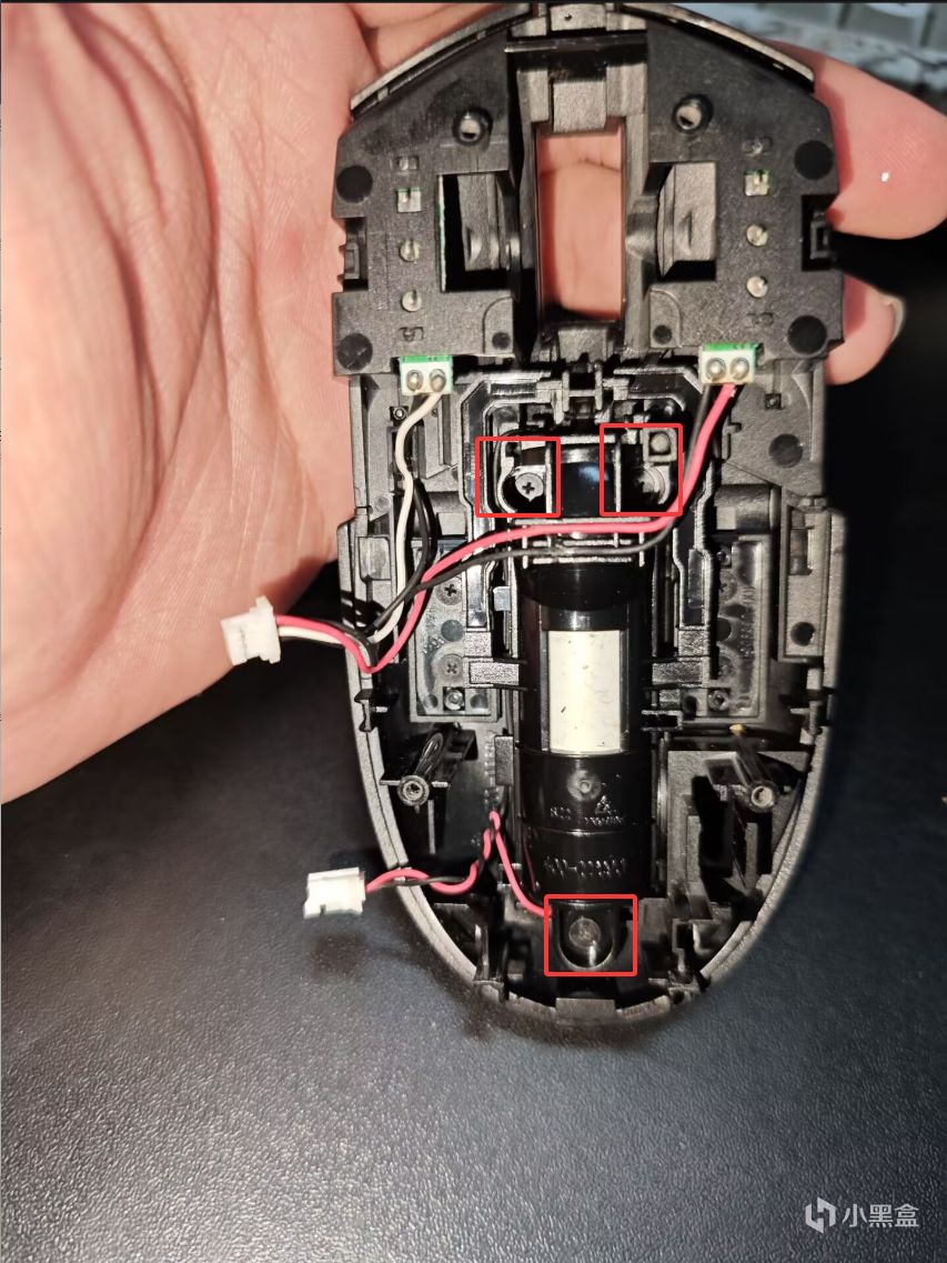 来到上盖,先将用胶水固定住的线材料分离,然后取下方框中的三颗螺丝,即可分离电池仓