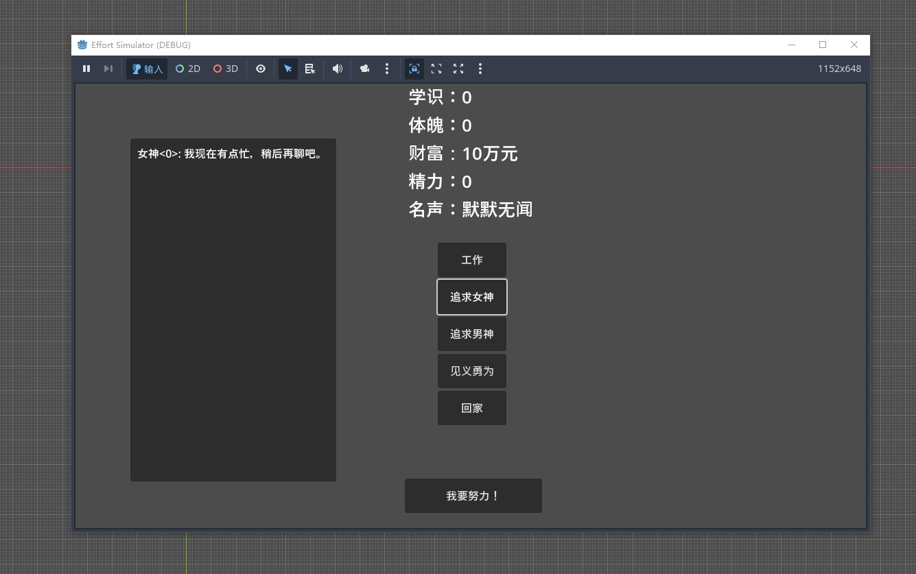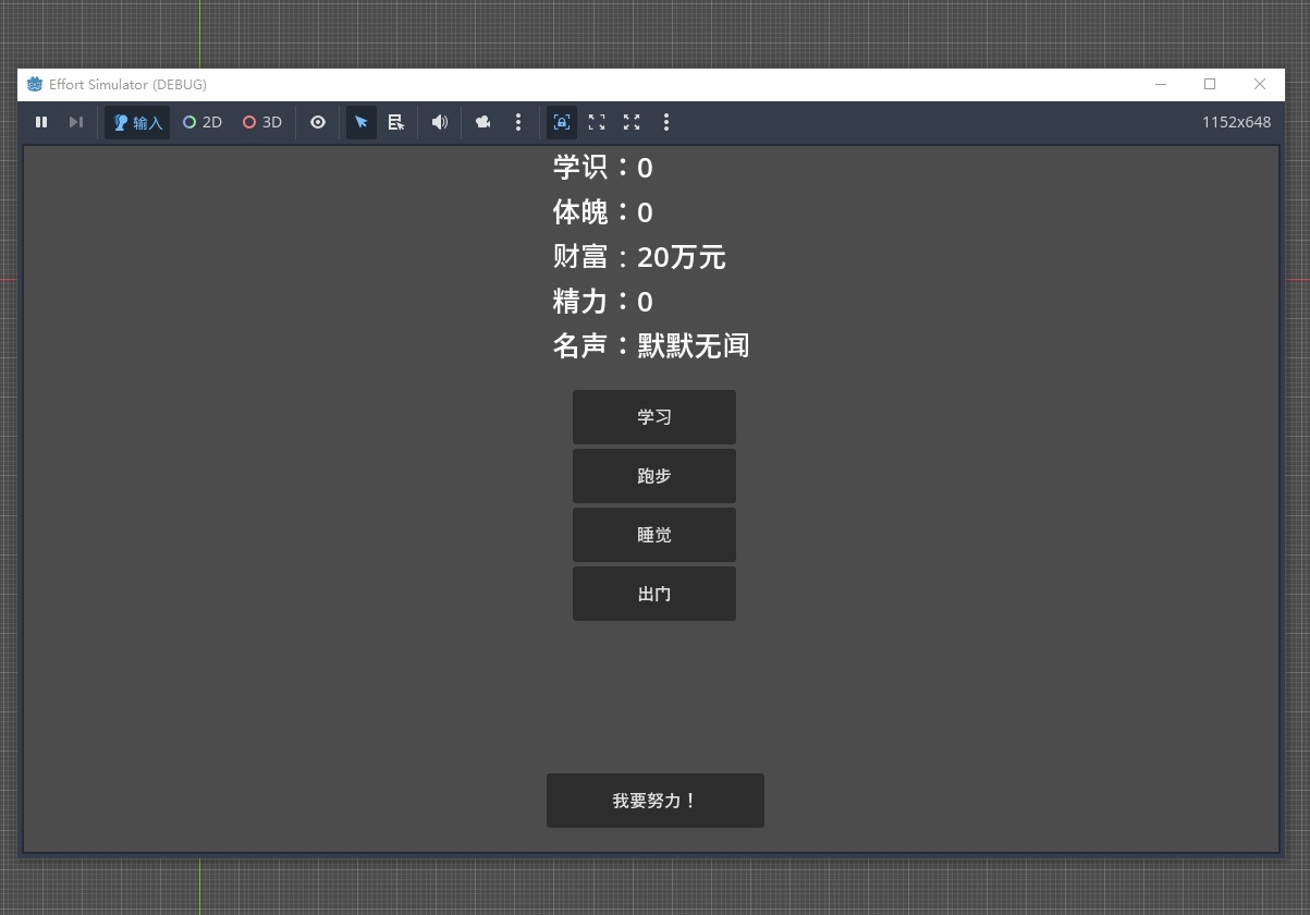 考虑到当前的知识储备,我设计了一个极简玩法的练习作品:《努力模拟器》。