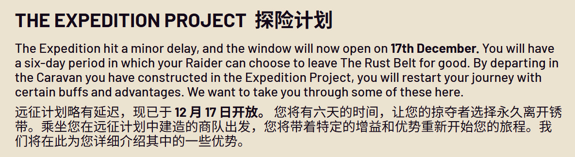 远征机制允许每位玩家在6天窗口期内选择离开Speranza城。更新称出发时将把玩家仓库所有物品计入远征项目,仓库物品与代币总值(每百万价值折算1点)将决定下个角色额外技能点(上限5点)。参与远征的玩家主要进度将重置,包括技能树、等级、仓库内容、工坊研发、制造技能与蓝图,但可跳过首次部署的训练环节,直接解锁完整地图与升级路线。