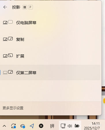 第四个选项仅第二屏幕 笔记本屏幕不亮,只有外接显示器会亮,建议大家日常就放在这个模式使用