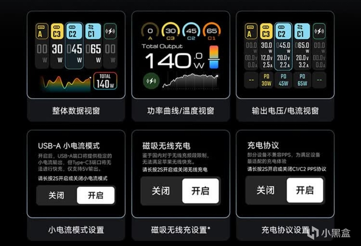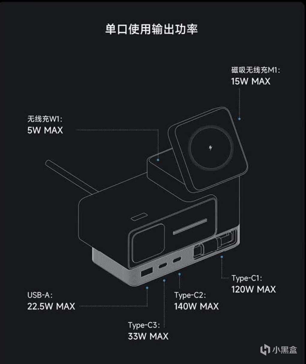 多口总输出:140W MAX,支持“多C口同时工作不断联”,不接A口的情况下不会断联。(140W确实比较遗憾)