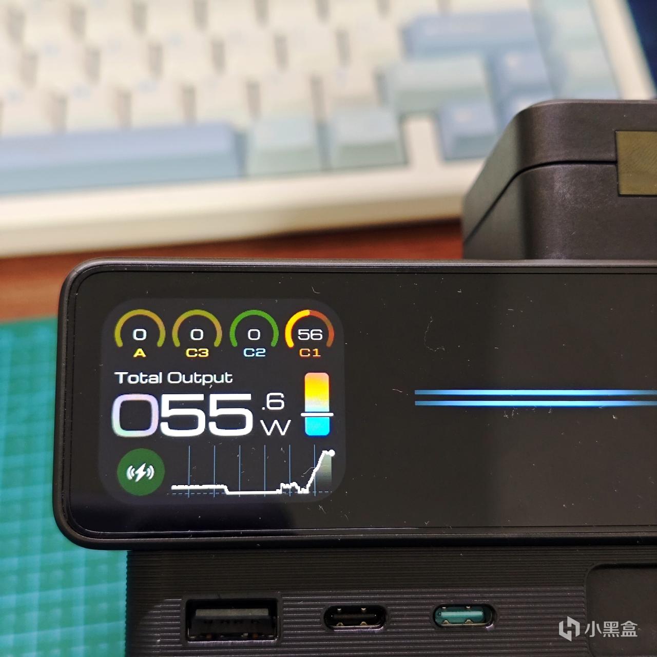 中间阶梯:1.83英寸TFT彩屏+蓝色星脉灯条,屏幕亮度与分辨率尚可,搭配实体按键可切换6种界面(总功率、单口电压电流、功率曲线、无线充控制等);