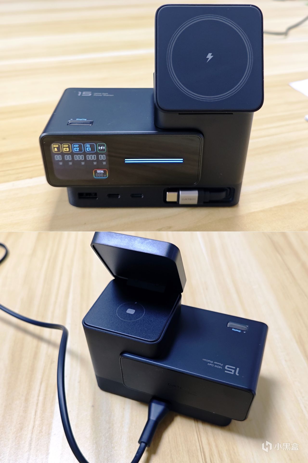 顶部阶梯:双无线充电区,上方为15W磁吸无线充(最大支持60度翻折悬停,iPhone适配7.5W),下方为5W普通无线充。)