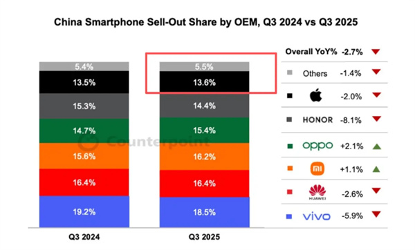 中国智能手机市场格局分散,竞争激烈,目前没有一家厂商占据超过20%的份额。Counterpoint数据显示,去年vivo已取代苹果成为市场第一。今年第三季度,vivo以18.5%的份额领先,苹果、荣耀、OPPO、小米和华为的市场占有率则介于13.6%至16.4%之间。