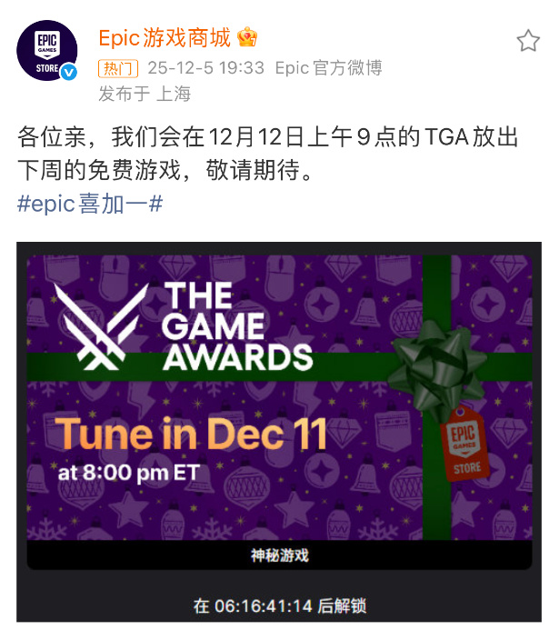 就在前几天,根据 Epic 官方发布的消息得知,将在 2025 年 12 月 12 日 上午 9 点的 TGA 正式揭晓神秘游戏。