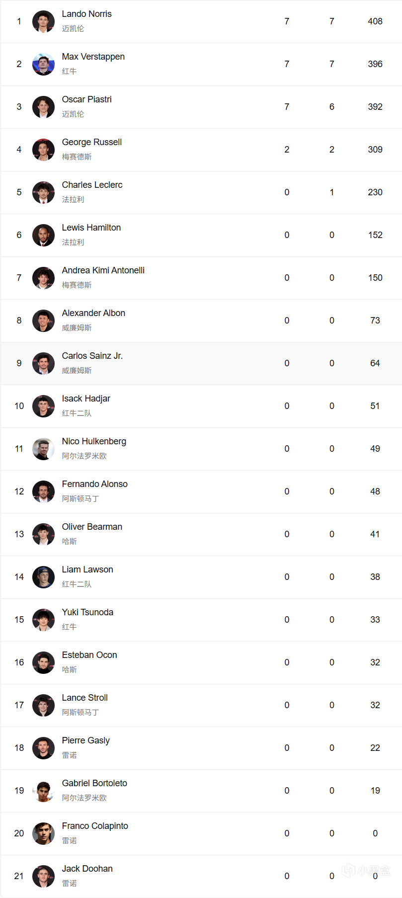 目前车手积分排名如下: