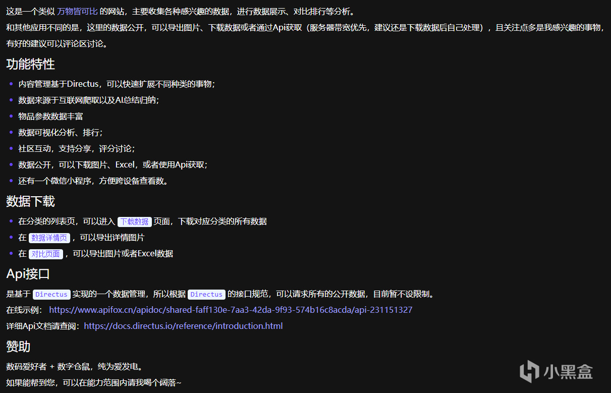 介紹:數據公開可通過 Api 獲取,且實現 Web、小程序、Api 的跨平臺數據同步更新,滿足用戶對各類事物的對比分析需求