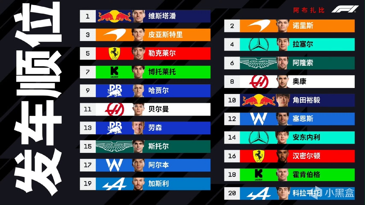 发车: 维斯塔潘守住杆位,皮亚斯特里超越诺里斯来到第二,若以当前结果完赛,诺里斯仍然领先维斯塔潘两分