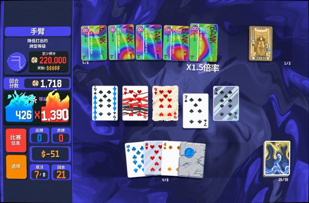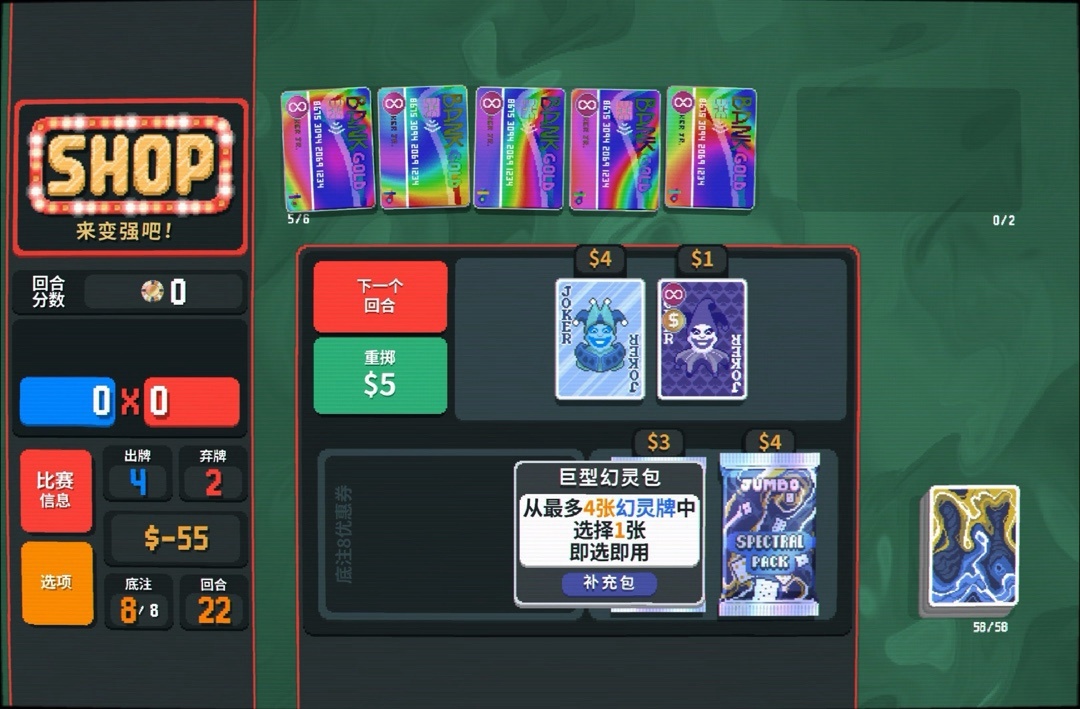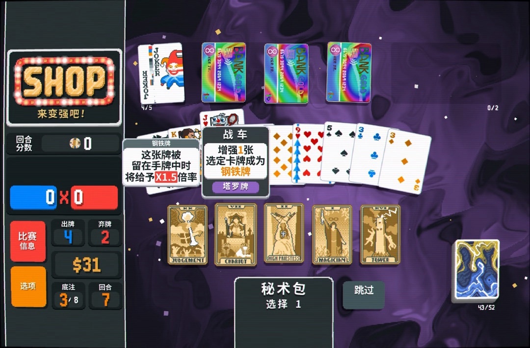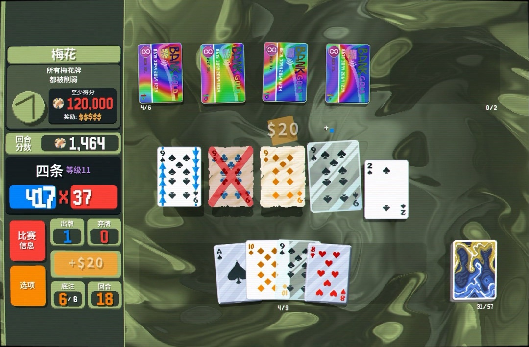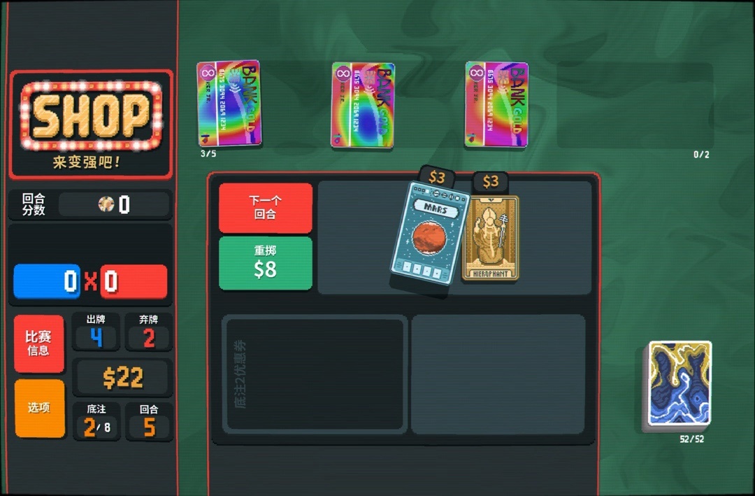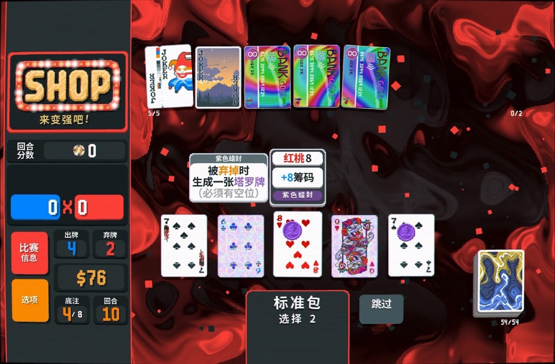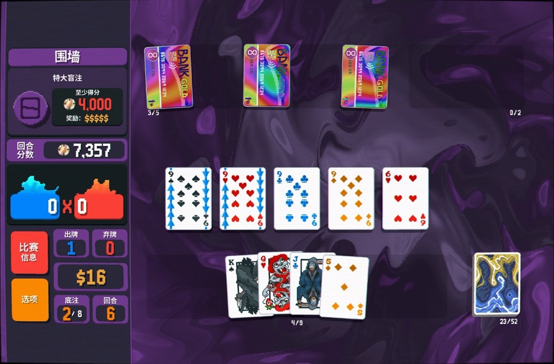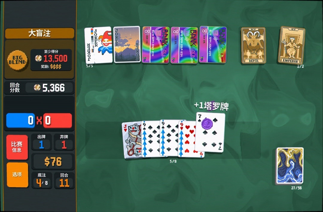 虽说现在打四条不稳定,但是由于手牌+1,打葫芦等大牌型过渡也是可以的,拿一张战车也可以暂时提供倍乘,不至于靠几张多彩信用卡裸打。