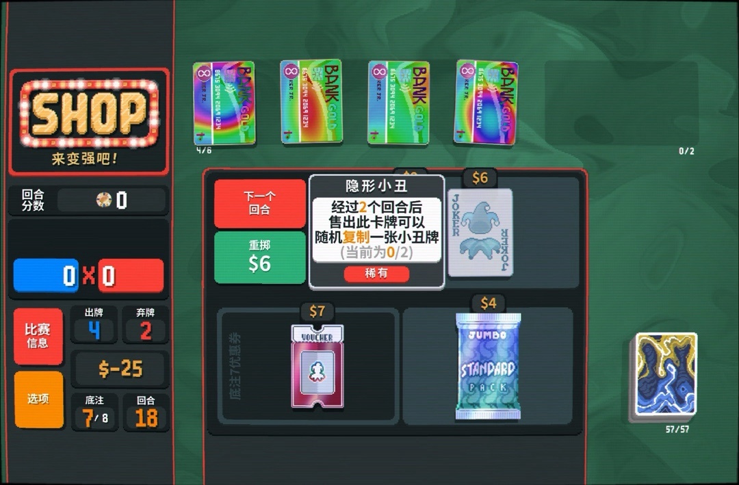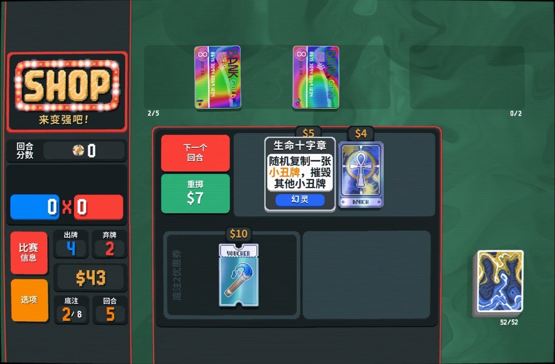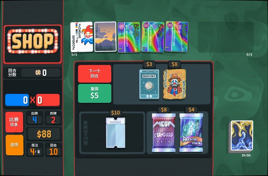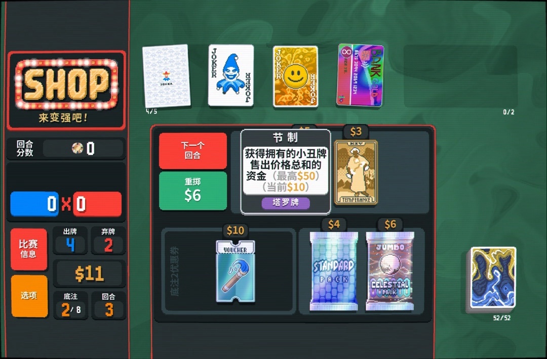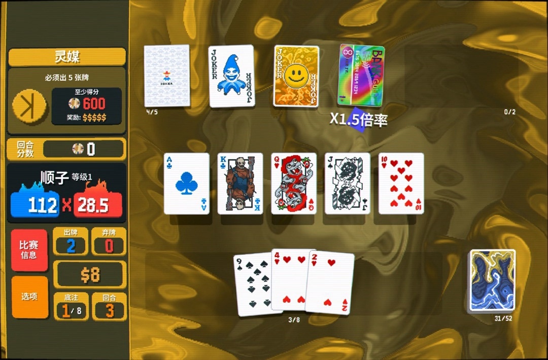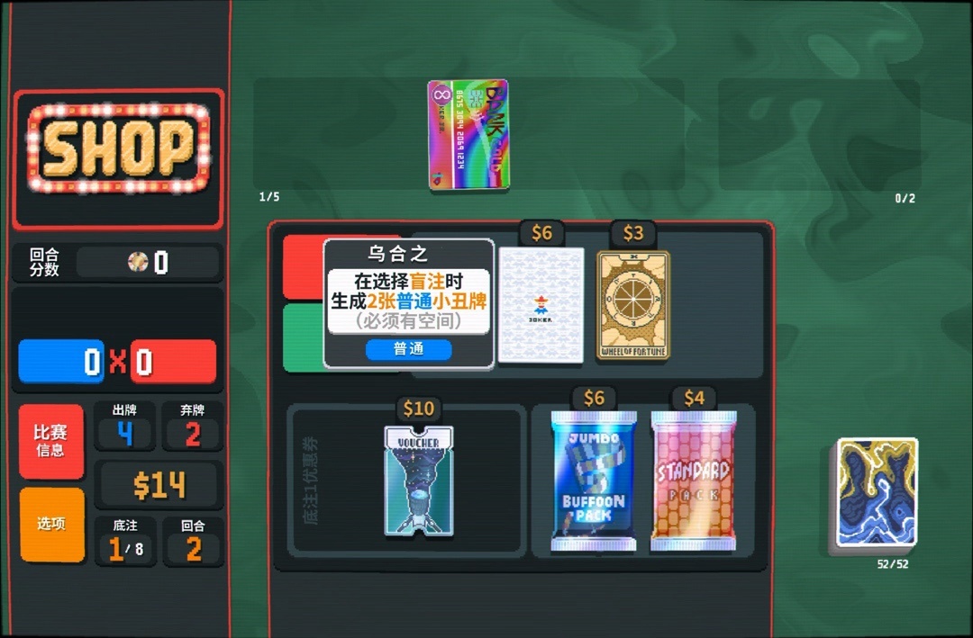 这里有个细节,为了下次乌合之众能重新再填两个小丑,就要卖掉现在留着的普通小丑。但不要全部卖掉,确保数值的情况下,进回合后保持5个小丑,这样节制能值更多钱。