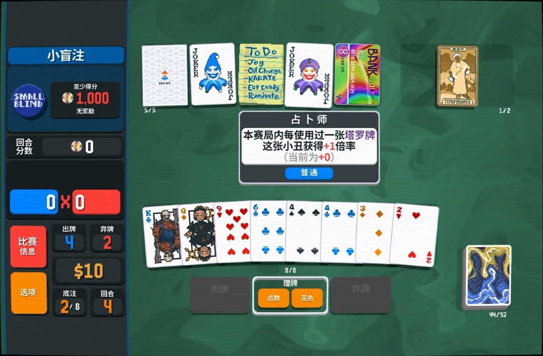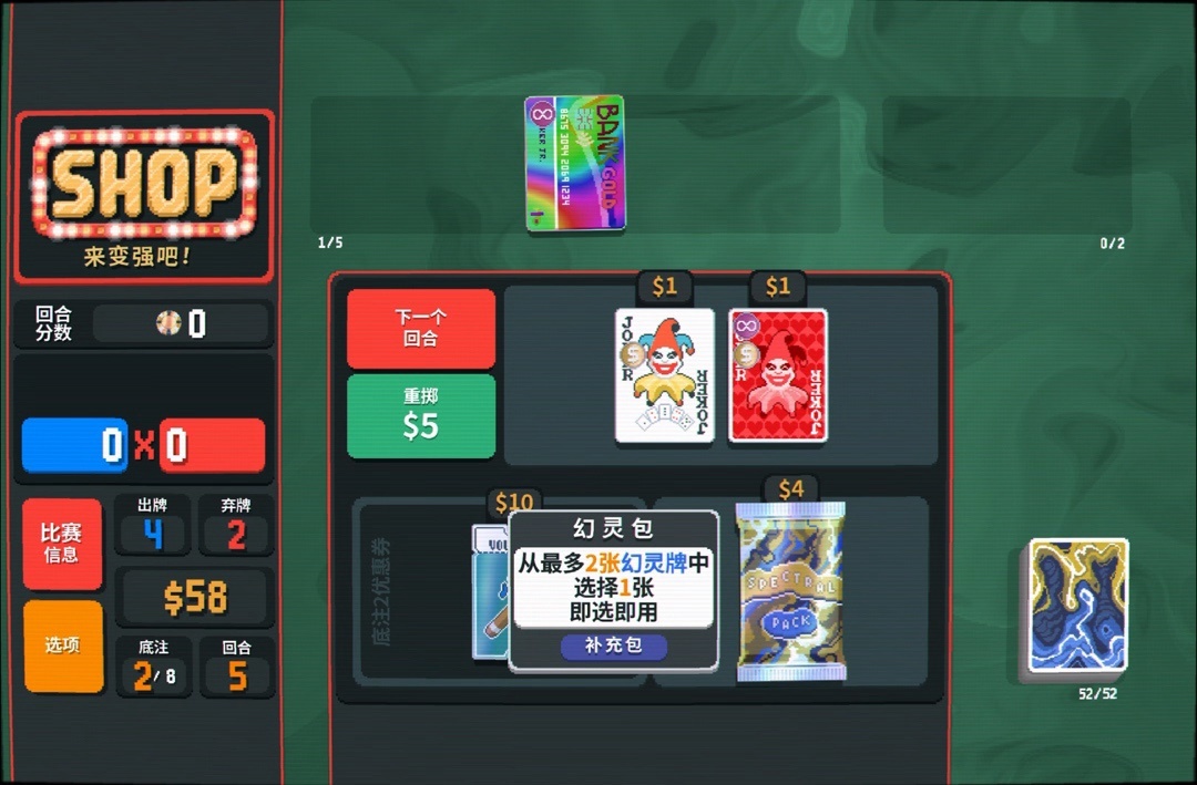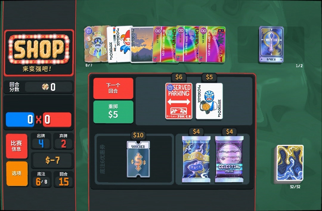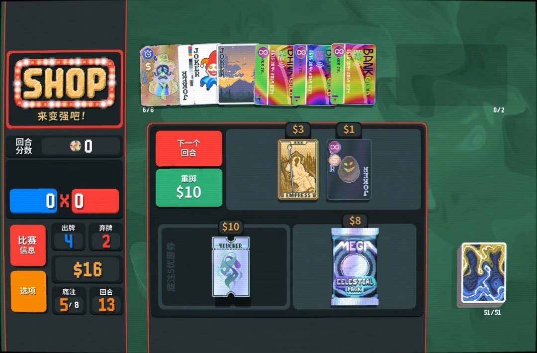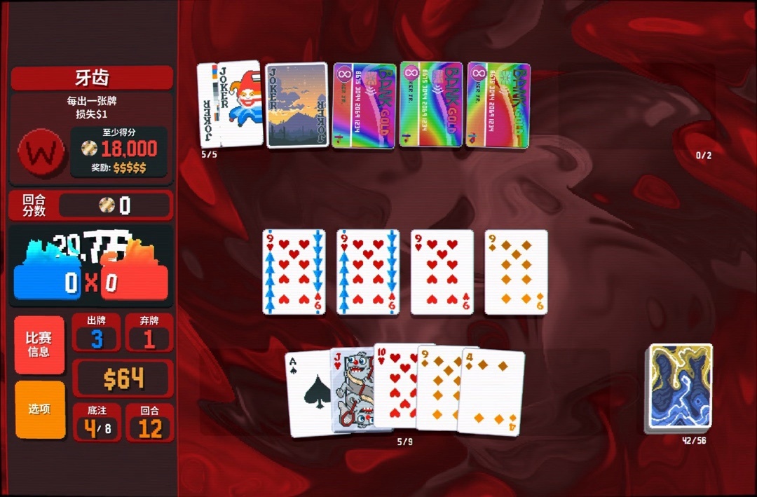 这里有个细节,为了下次乌合之众能重新再填两个小丑,就要卖掉现在留着的普通小丑。但不要全部卖掉,确保数值的情况下,进回合后保持5个小丑,这样节制能值更多钱。