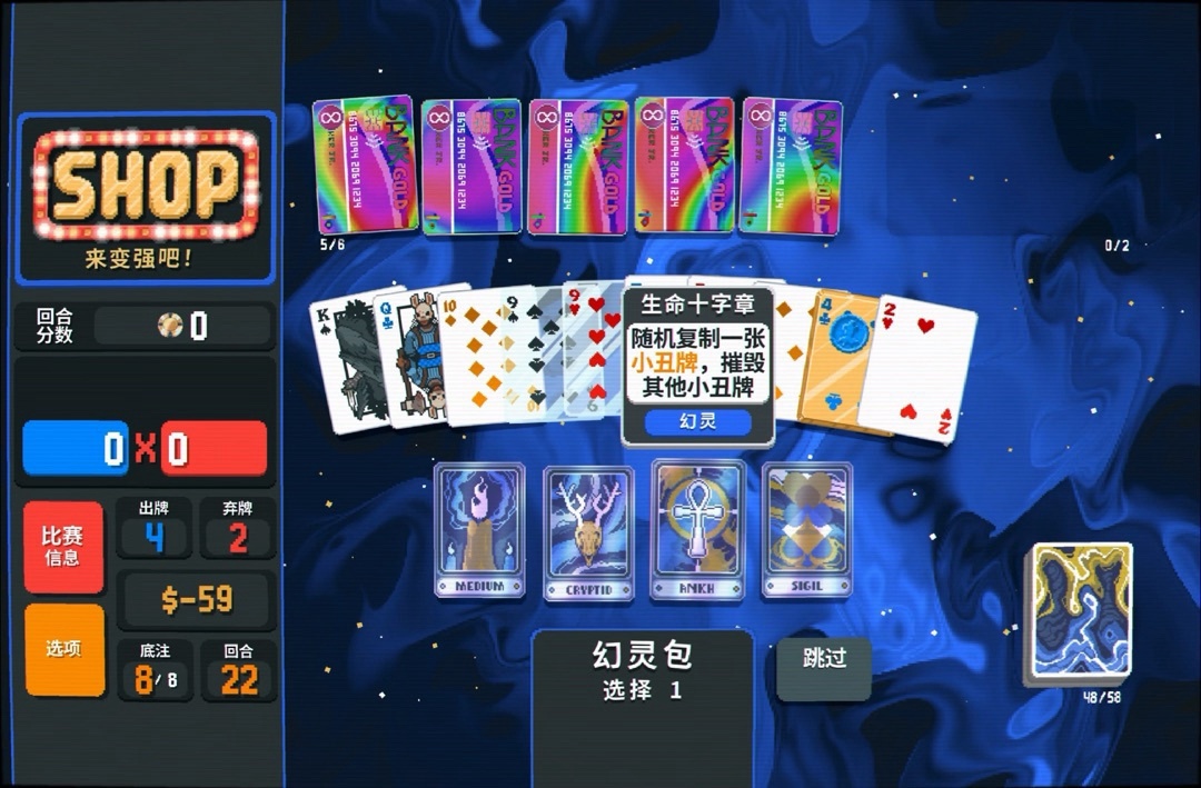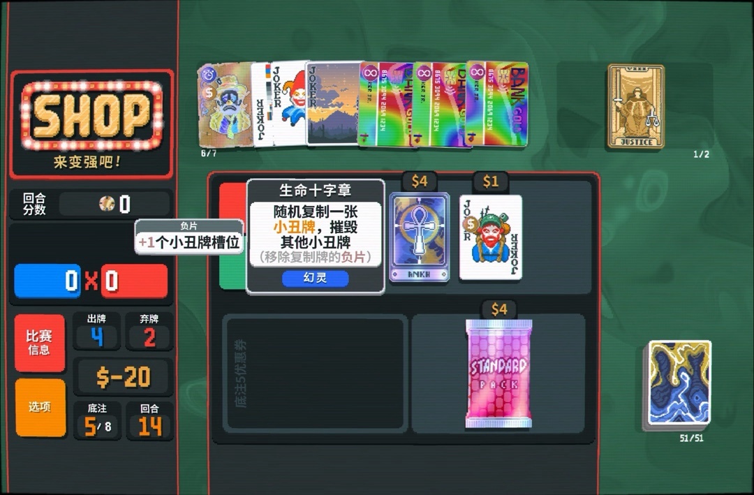 这个底注有生命十字章,所以需要大量重掷商店,经济转负是免不了的,所以流浪者可以拿一下多吃点塔罗牌,还是负片不占位置