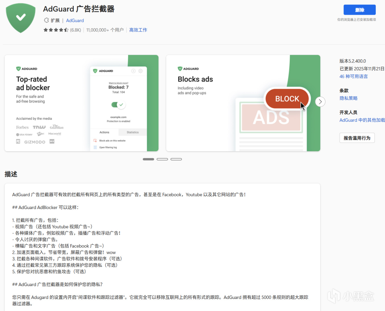 AdGuard广告拦截器拦不下来,但这个拓展能把你所见到的所有广告全部拦下来,对,是的,所有广告(甚至包括网页版B站的推广视频,以及所有网页的赞助商广告)它就是神!
