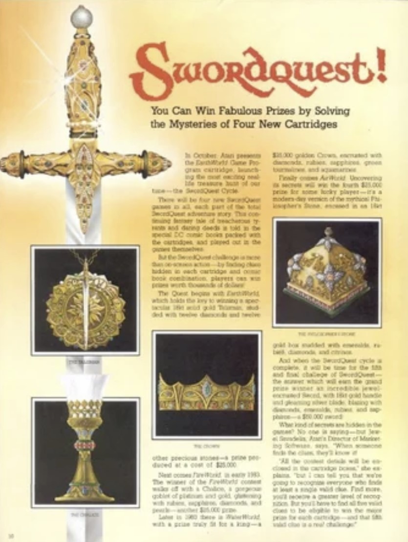 《寻剑》(Swordquest)游戏系列,1982年发行第一部,这是一个未完成的电子游戏系列作品。
