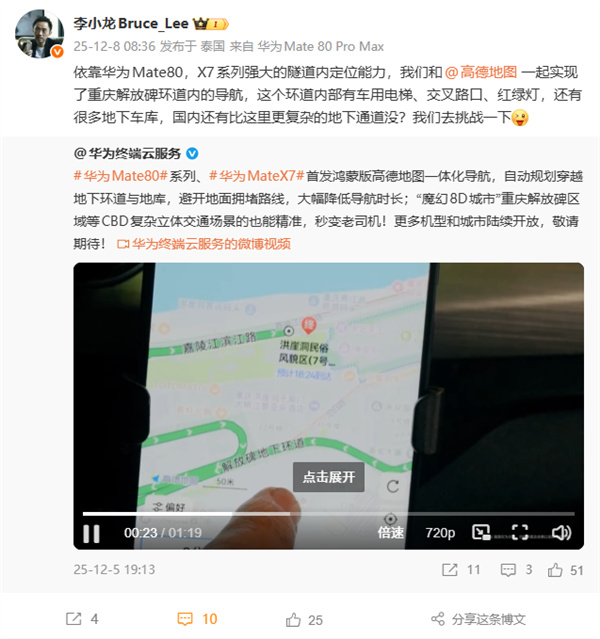 他表示,依托华为Mate80、MateX7系列强大的隧道内定位技术,华为与高德地图联手完成了重庆解放碑环道的精准导航。