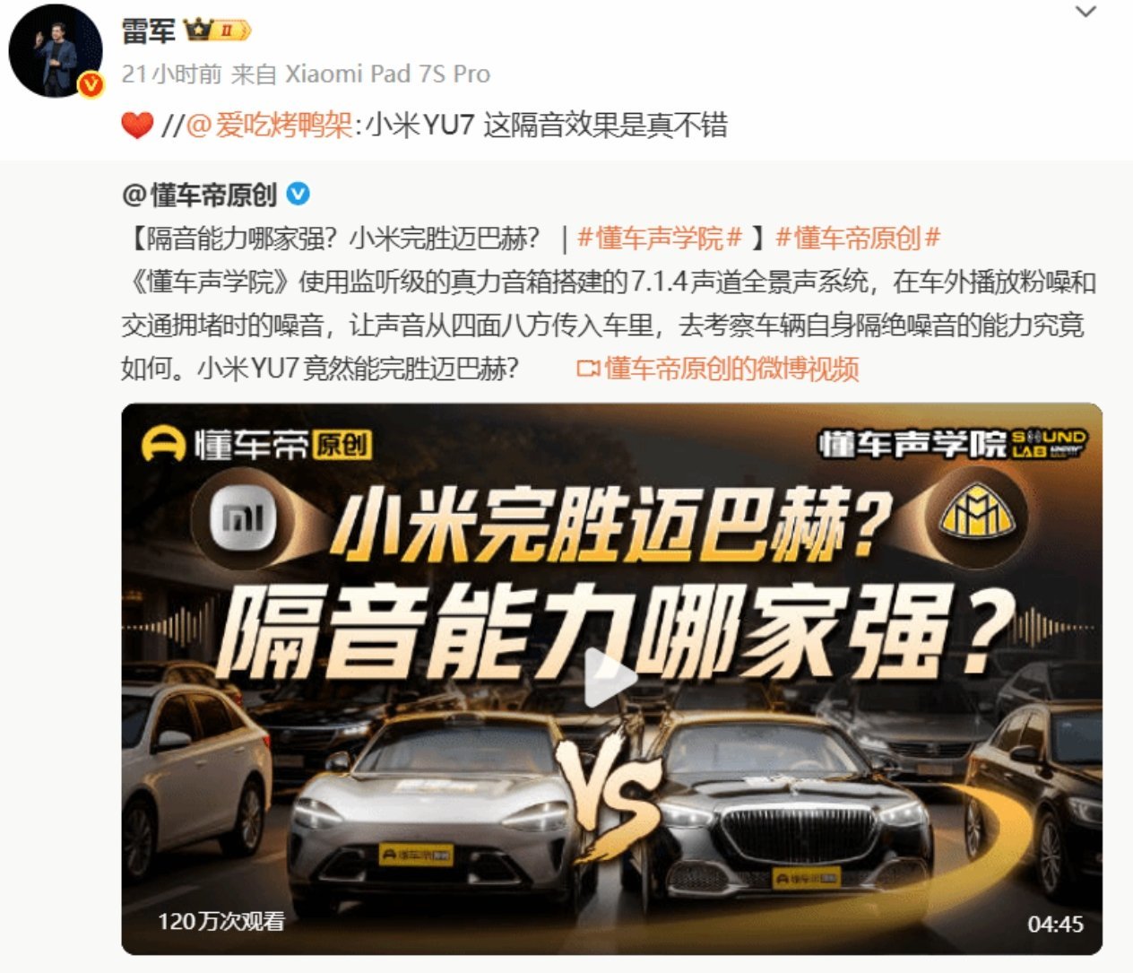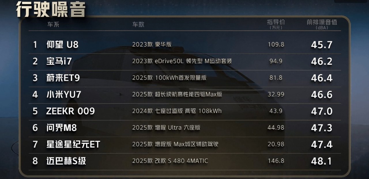 懂车帝最新隔音测试结果出炉,小米YU7 Max在静态隔音项目中以56.9dBA的成绩位列第一,超越了指导价超过300万元的奔驰迈巴赫S680 4MATIC等豪华车型。